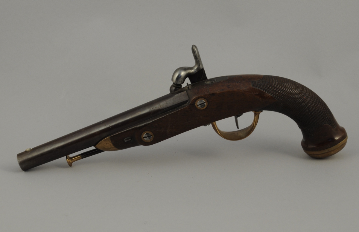 PISTOLET À SILEX, TRANSFORMÉ À PERCUSSION, D'OFFICIER MODÈLE 1816. Canon rond à pans au tonnerre. Crosse en noyer quadrillée. Garnitures en laiton, baguette en fanon.