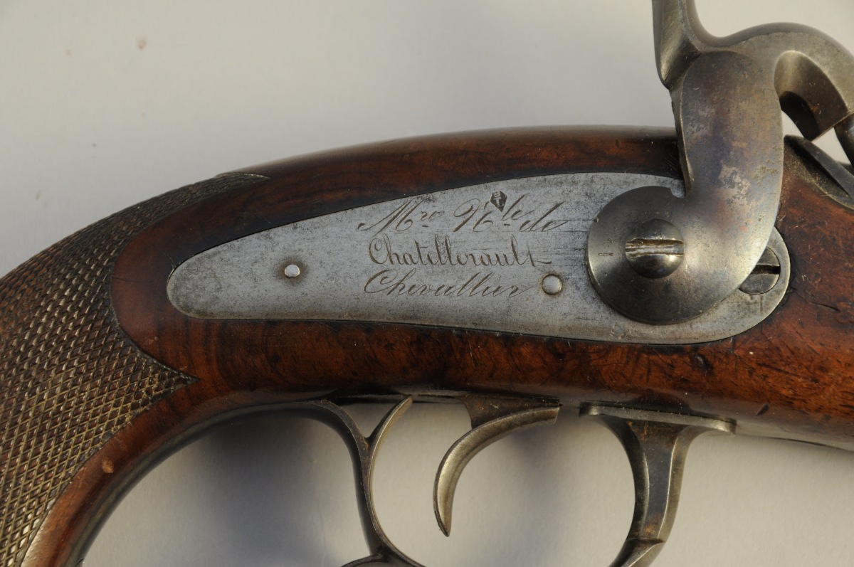 PISTOLET D'OFFICIER À PERCUSSION, modèle 1833. Canon en damas à pans légèrement tromblonné, daté 1851 et marqué "MN" au tonnerre. Crosse en noyer quadrillée. La platine gravée "Mre Rle de / Chatellerault / Chevallier". Calotte à anneau mobile, baguette en fer. La crosse poinçonnée G couronné et CA.
