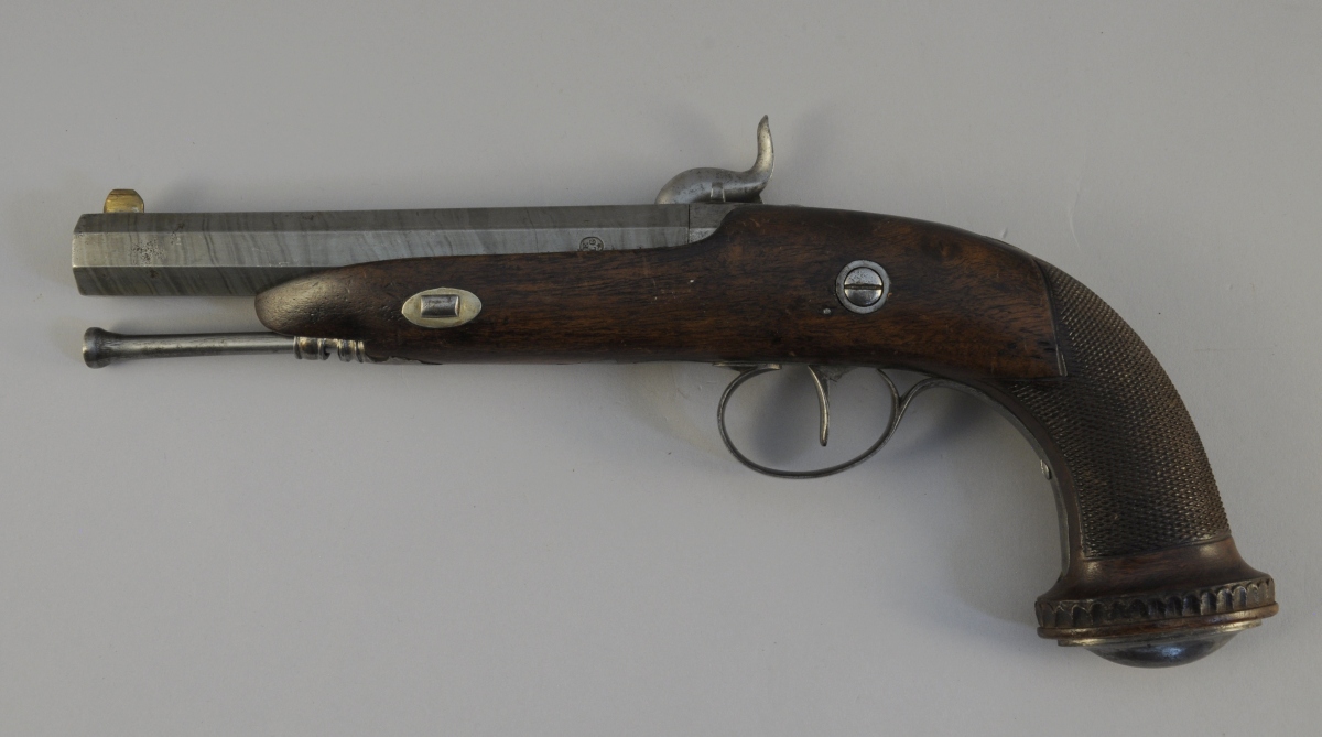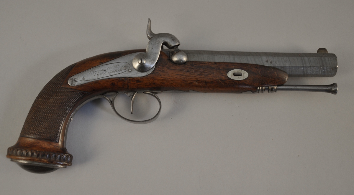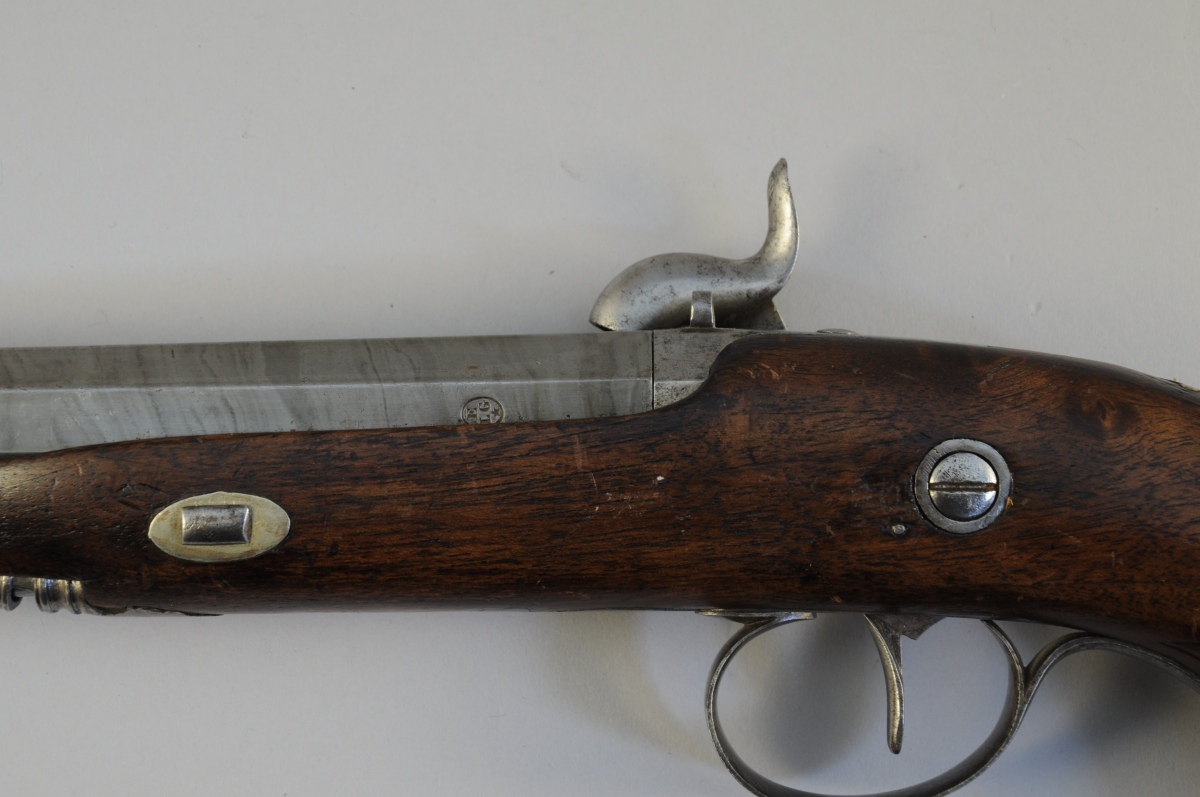 PISTOLET D'OFFICIER À PERCUSSION. Canon en damas à pans. Crosse en noyer quadrillée. Garnitures en fer. Calotte sculptée d'une frise feuillagée. Poinçon du banc d'épreuve de Liège. Platine signée "Cappez (?) Armr / 4em hussards".