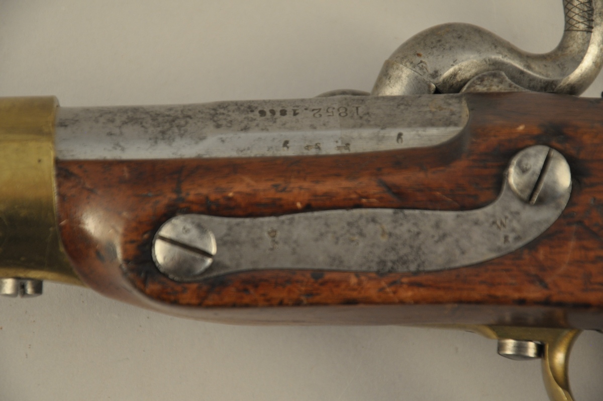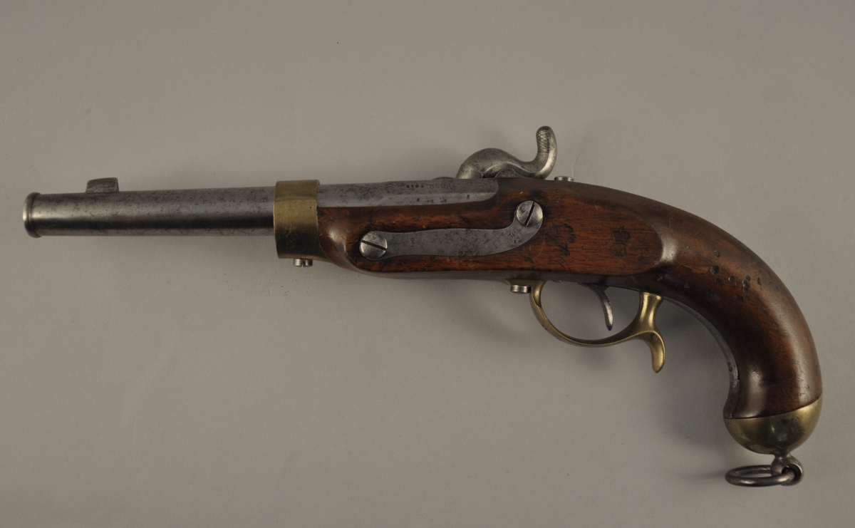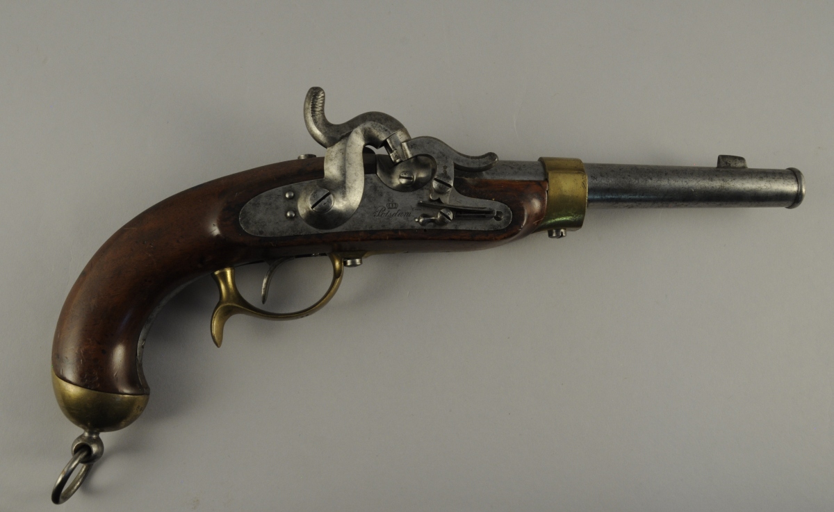 PRUSSE. PISTOLET DE CAVALERIE À PERCUSSION, MODÈLE 1851, canon rond à pans au tonnerre daté 1852.1866. Crosse en noyer poinçonnée. Garnitures en laiton poinçonnées, anneau de calotte en fer, le pontet matriculé: "U.R.13.2.E.86.". La platine signée "Potsdam" surmonté de la couronne impériale. Bel état.