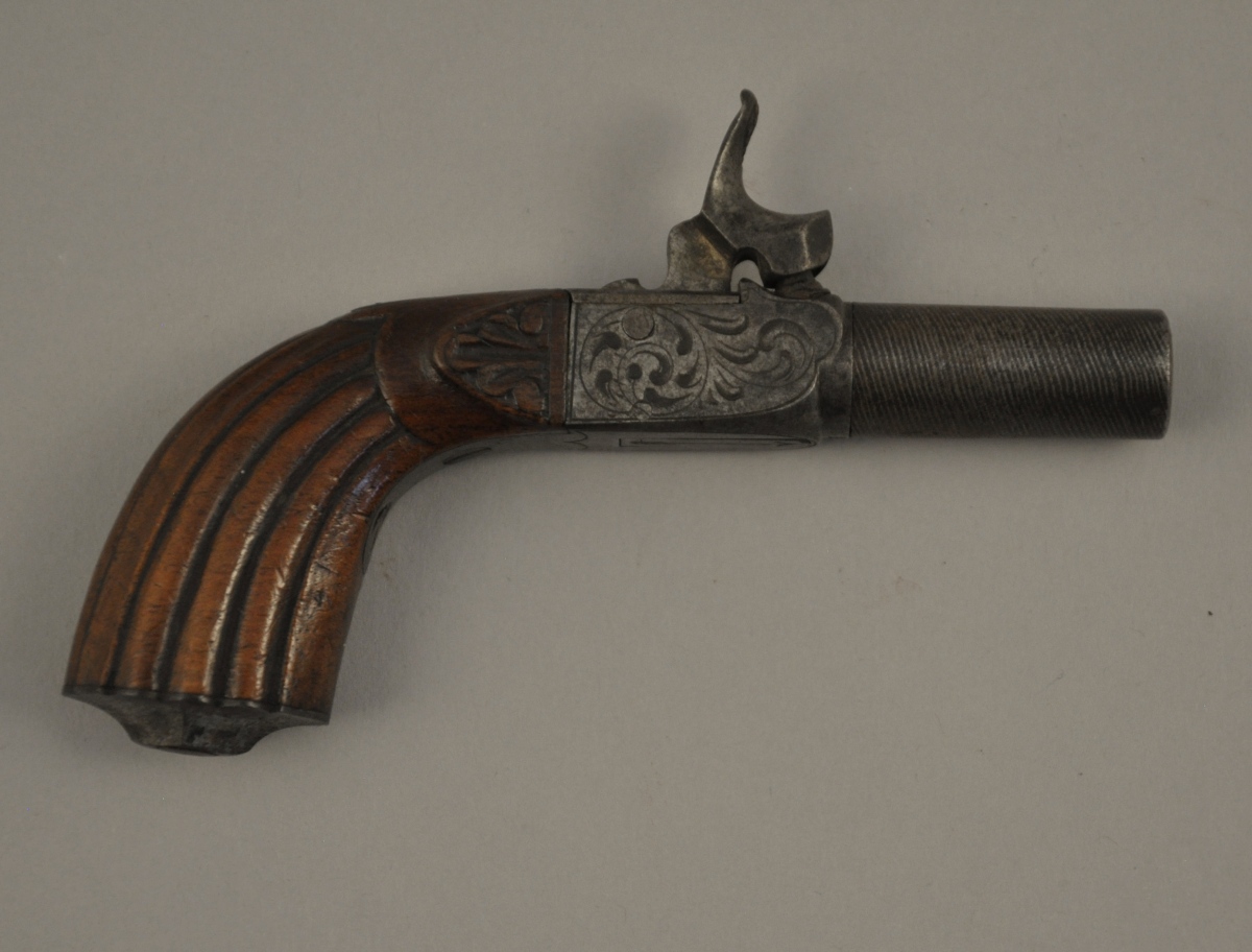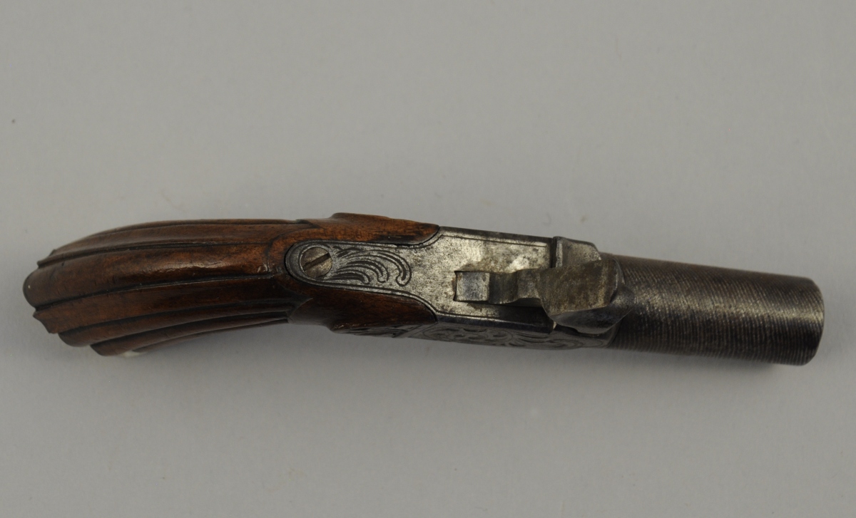 PISTOLET À COFFRE à percussion. Canon en damas rond. Coffre gravé de rinceaux. Détente rentrante. Crosse en noyer sculptée d'une palmette et de godrons.