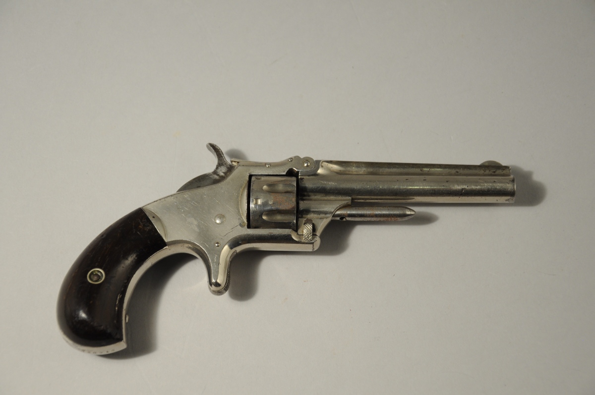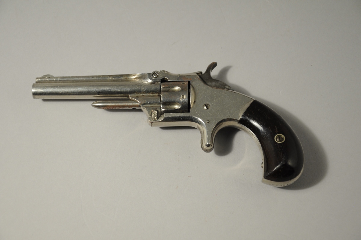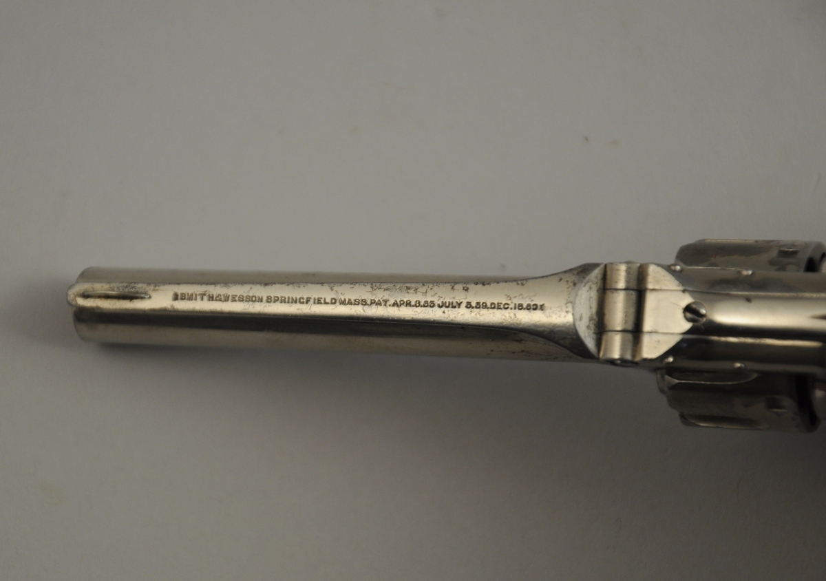 REVOLVER SMITH & WESSON n°1, third issue, à percussion annulaire, simple action, 7 coups, calibre 22. Canon signé sur la bande " SMITH & WESSON SPRINFIELD, MASS. PAT. Apr. 3. 55 July 5. 59 Dec. 18.60 ". Calotte numérotée 130216 . Plaquettes de crosse en noyer, finition nickelée.