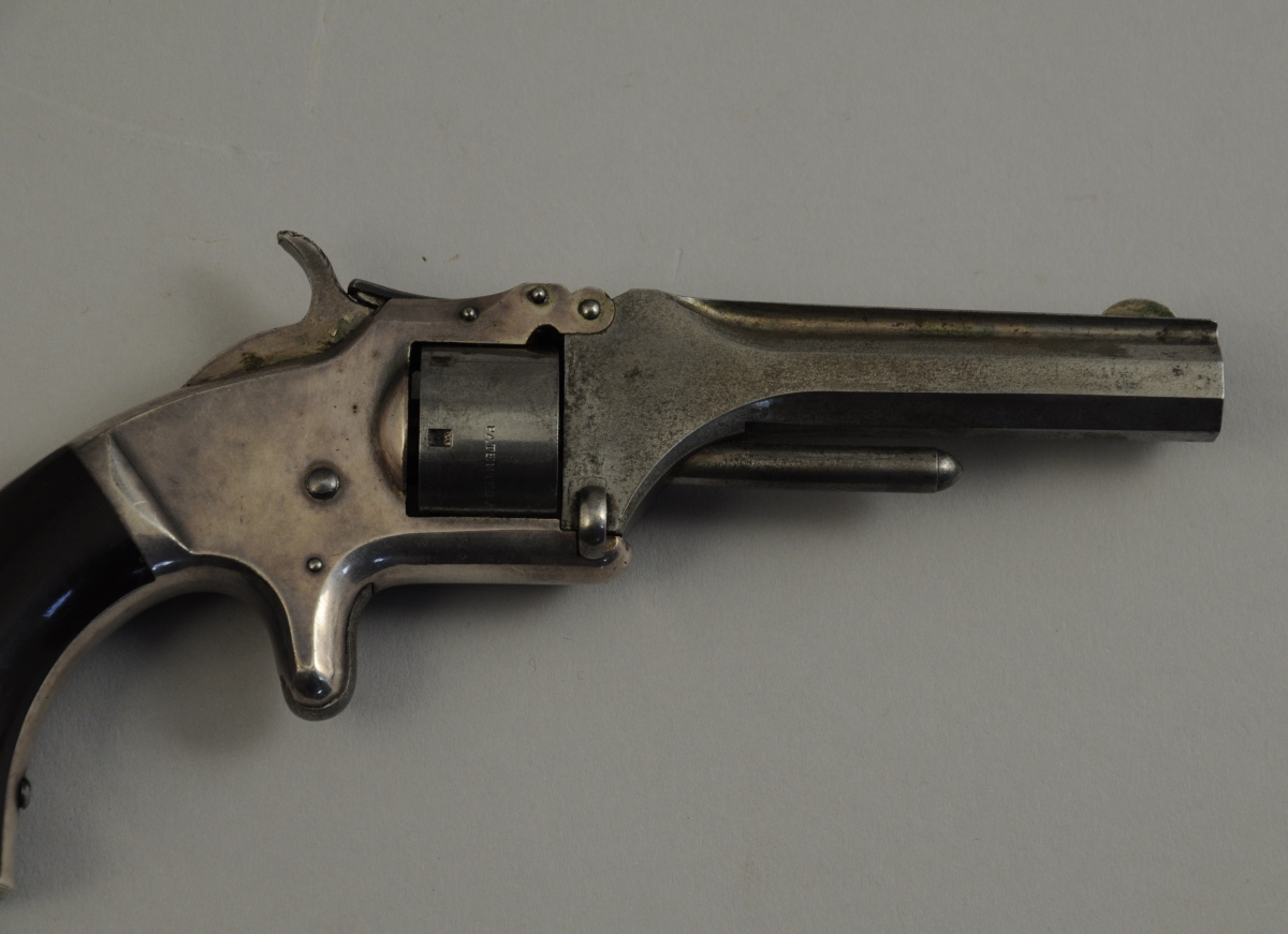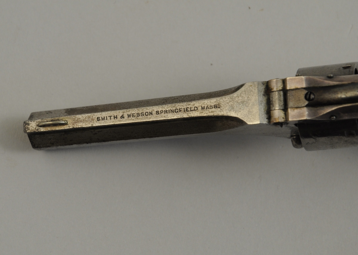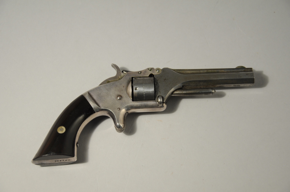 REVOLVER SMITH & WESSON n°1, second issue, à percussion annulaire, simple action, 7 coups, calibre 22. Canon signé sur la bande "SMITH & WESSON SPRINGFIELD, MASS. ". Calotte numérotée 119220 . Plaquettes de crosse en noyer.