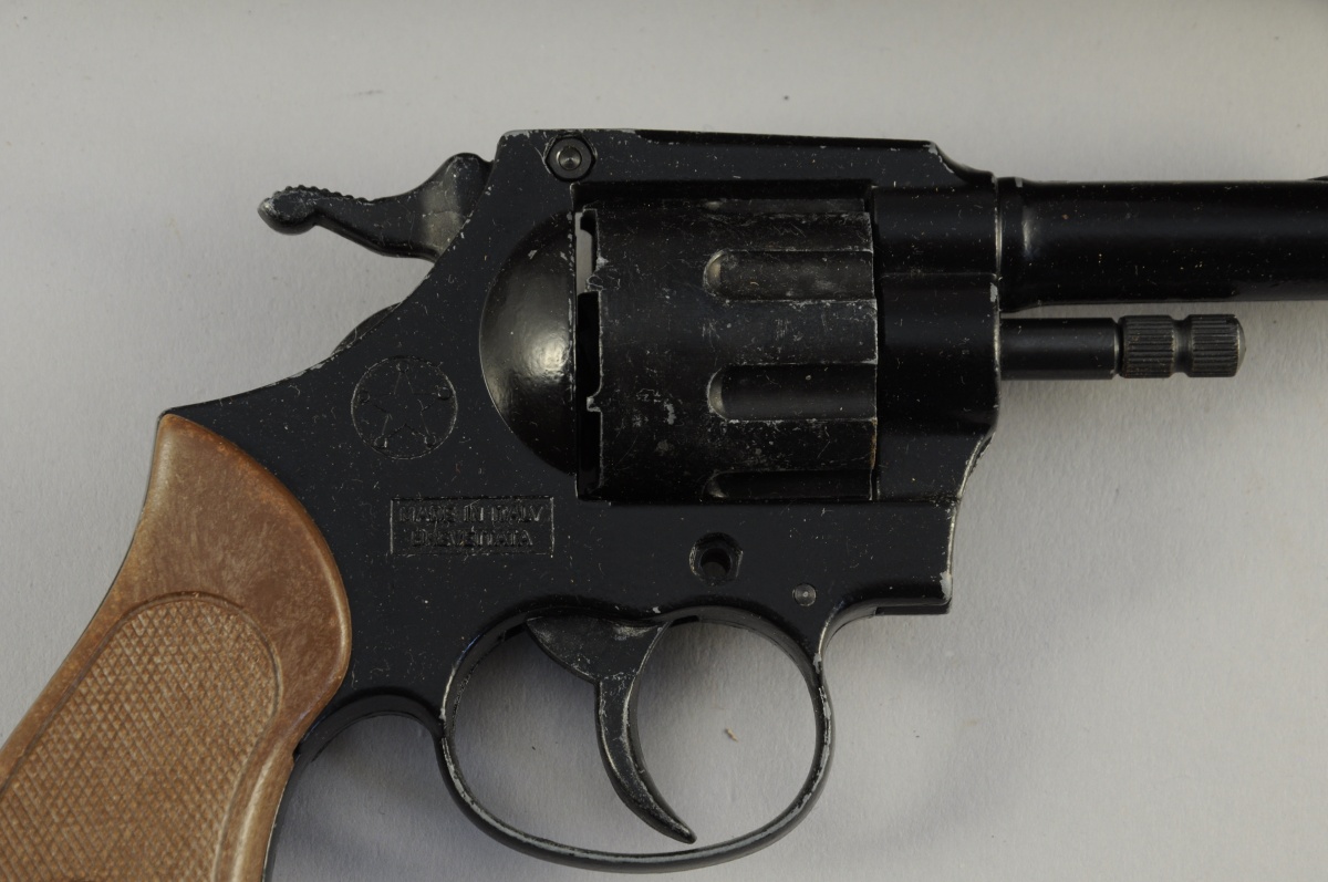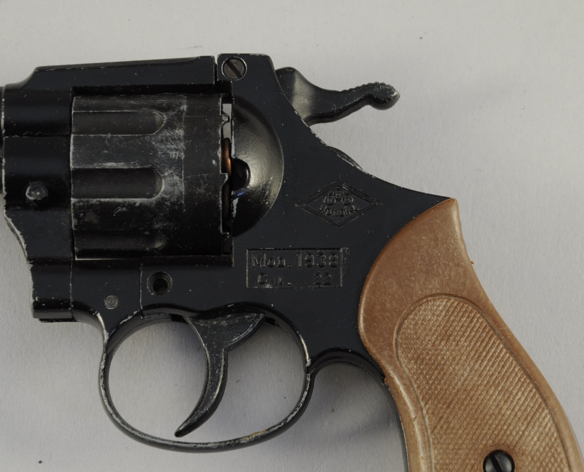 REVOLVER D'ALARME, 6mm, "Mod. 1938", Mondial. Finition noircie. Crosse à plaquettes en matière plastique. Dans un étui en cuir.