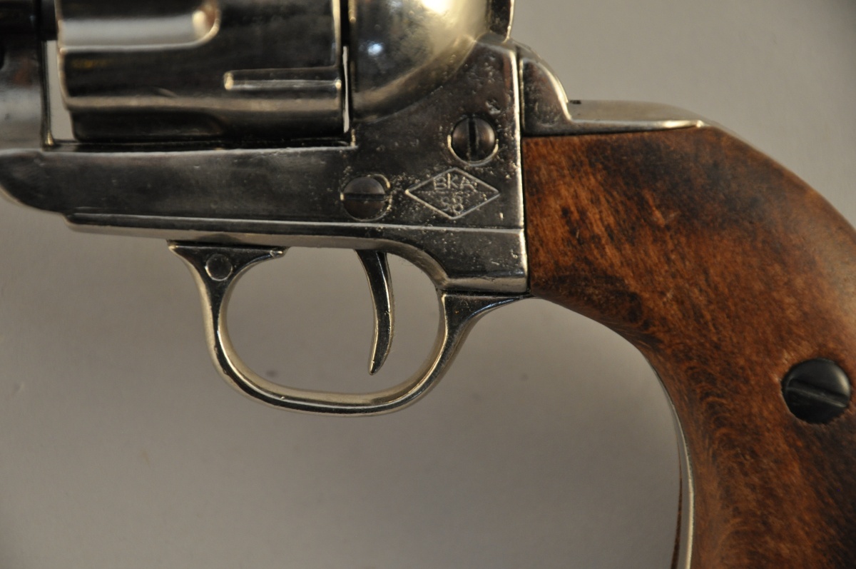 JOINT: REVOLVER type Colt ou Remington factice. Finition nickelée. Crosse à plaquettes de bois.