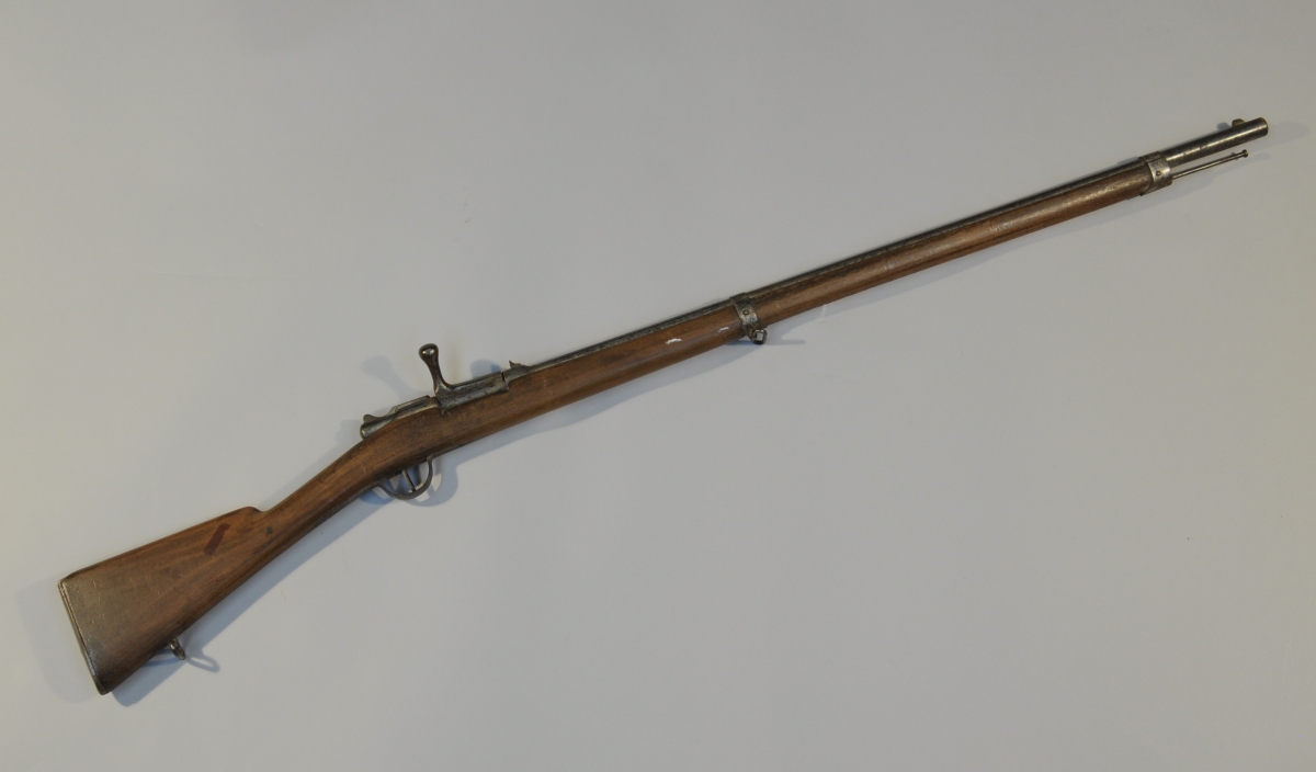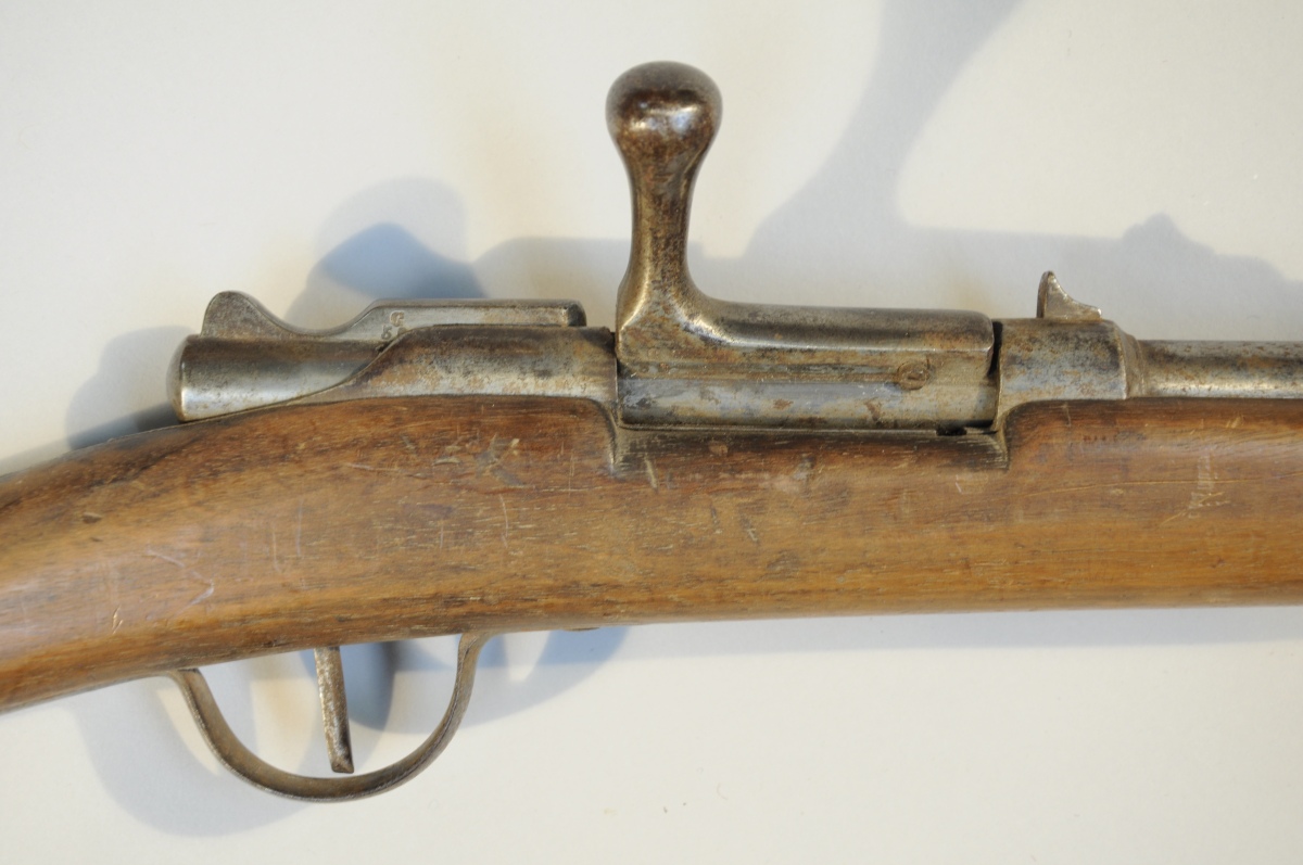 FUSIL GRAS DES BATAILLONS SCOLAIRES. Canon rond. Garnitures en fer. Poinçonné « C 50». Crosse en noyer avec marquage "Fusil scolaire Mre A St Etienne 1882" et monogramme "MW".