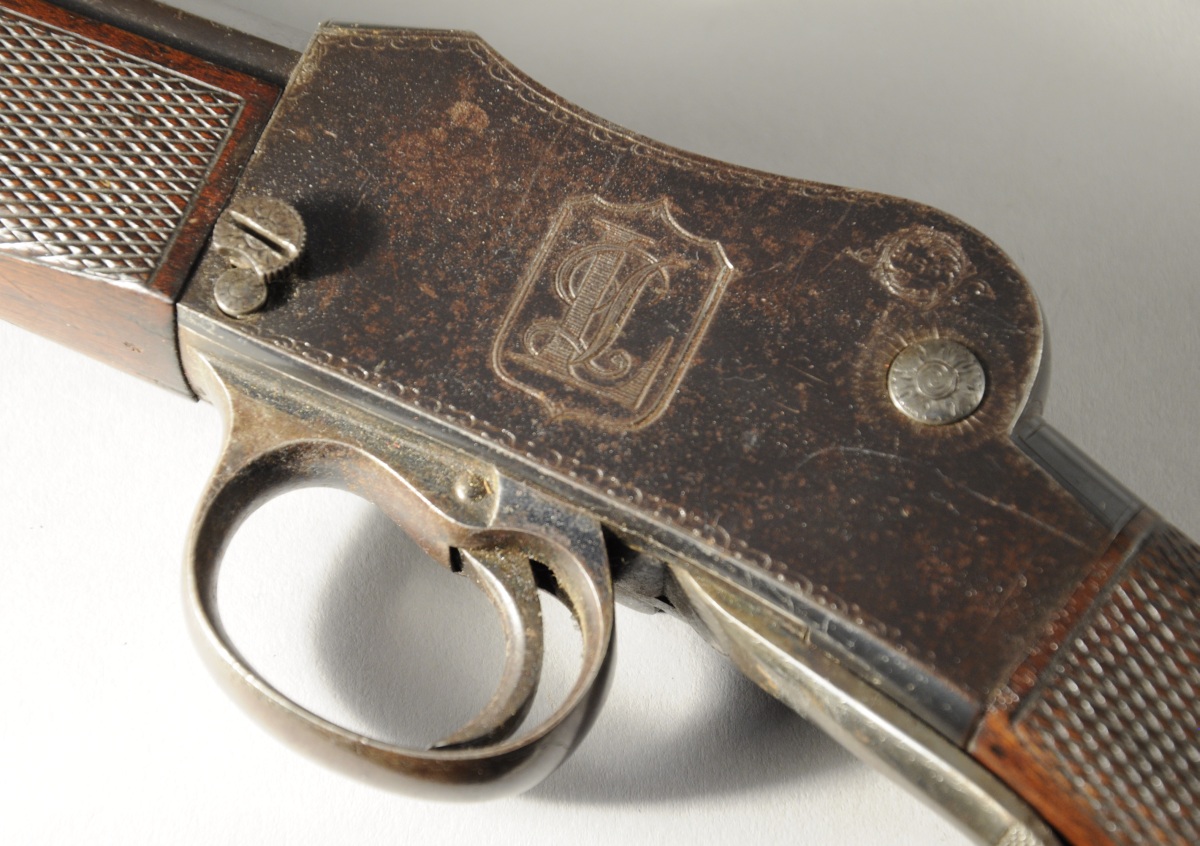 Garnitures en fer. Crosse en noyer. Monogrammée "LP" dans un écu et marque "166". N° 5116