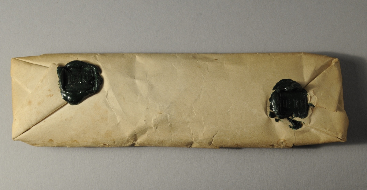HERBE DE LA TOMBE DE CHÂTEAUBRIANT (?). PAPIER plié. Porte l'inscription manuscrite à l'encre: "Herbe recueillie sur la tombe de Châteaubriant / Rocher du Grand-Bé (11 Septembre 1850) (St-Malo.). Fermé par deux cachets de cire verte portant les initiales "MD".