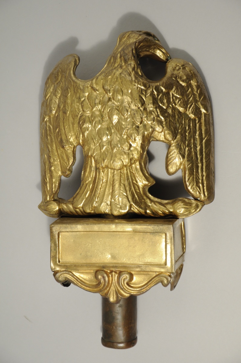AIGLE DE DRAPEAU DE LA GARDE NATIONALE en tôle emboutie et dorée, modèle 1852, présidence de Louis-Napoléon Bonaparte. Elle présente son profil gauche, les ailes mi-déployées aux extrémités pointées vers le bas. Elle tient dans ses serres le fuseau de Jupiter et repose sur un caisson portant les initiales "LN" souligné de volutes et fleurons. L'ensemble monté sur une douille circulaire.