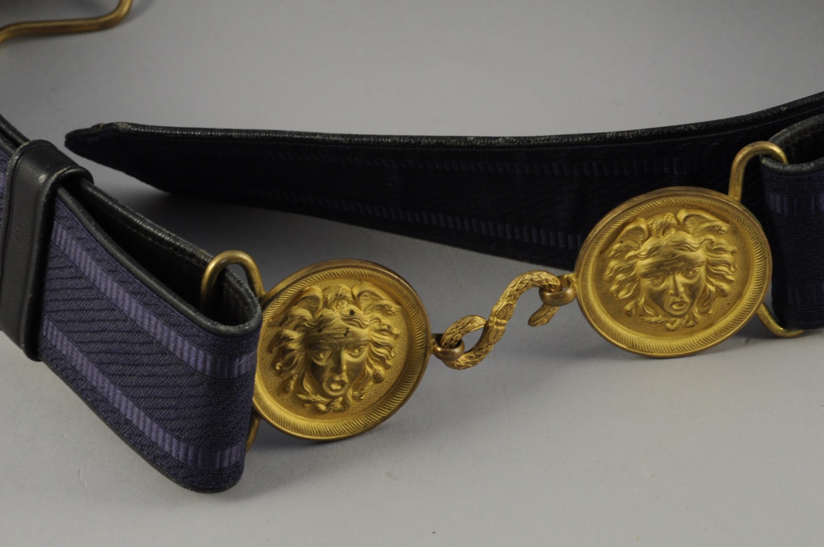 CEINTURON PORTE-ÉPÉE en passementerie bleue doublée de maroquin bleu. Boucle-agrafe en laiton doré à tête de Méduse.