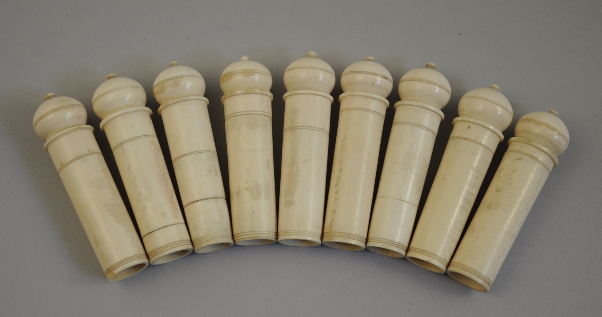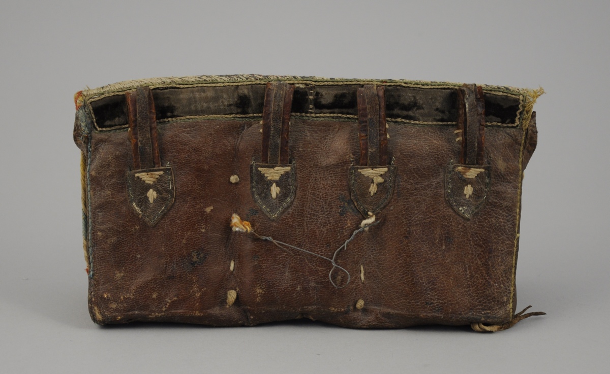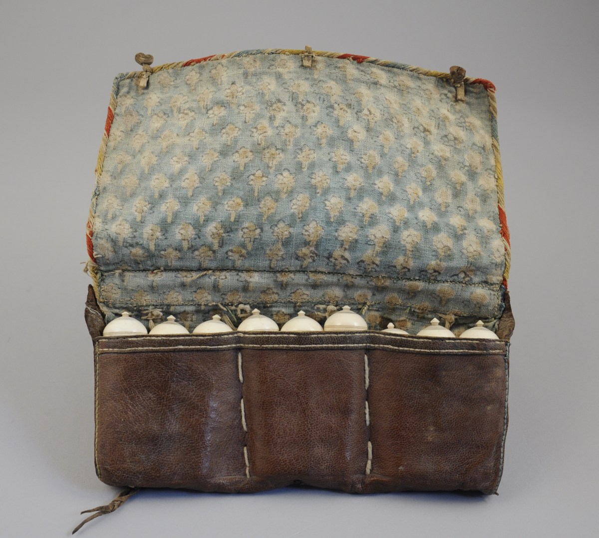 CAUCASE. CARTOUCHIÈRE en cuir. Pochette rectangulaire, à rabat brodé de fils métalliques et polychromes, dessinant une composition florale. À l'intérieur, trois compartiments contiennent neuf petits cylindres en os achevés en dôme.