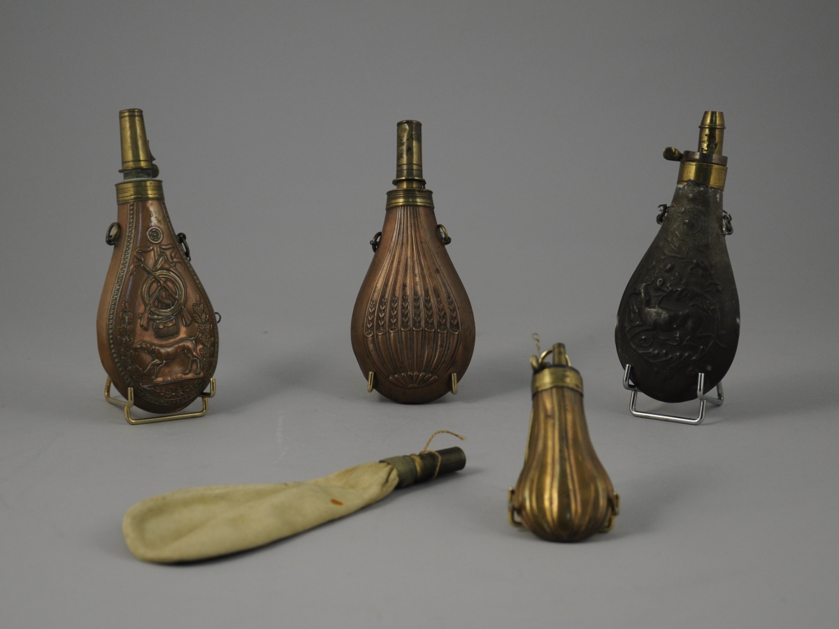 -La première en cuivre repoussé à décor d'un trophée de chasse et d'un chien flanqués de branches de chêne et encadrés d'un rais de perles. Bec en laiton avec bouchon. Marquée "4 on", signée J.N. à Paris N.".