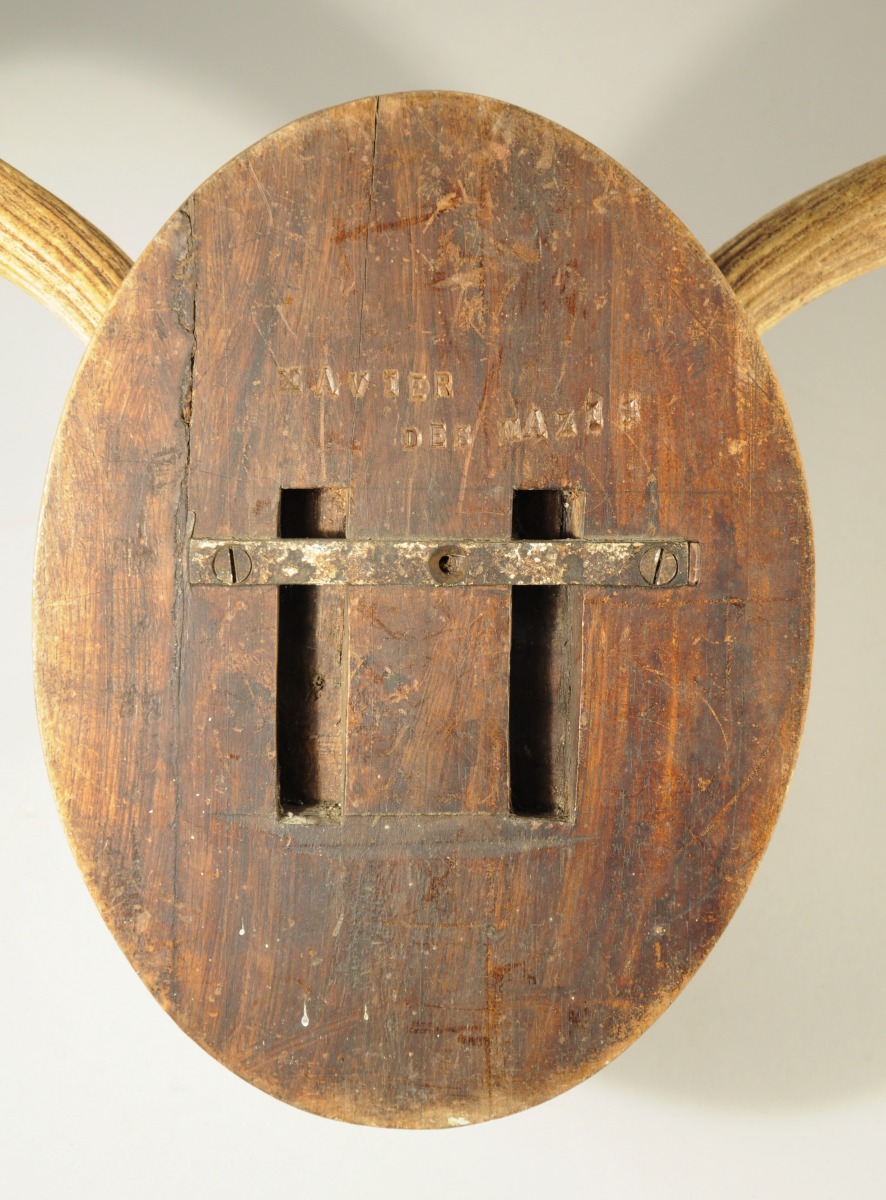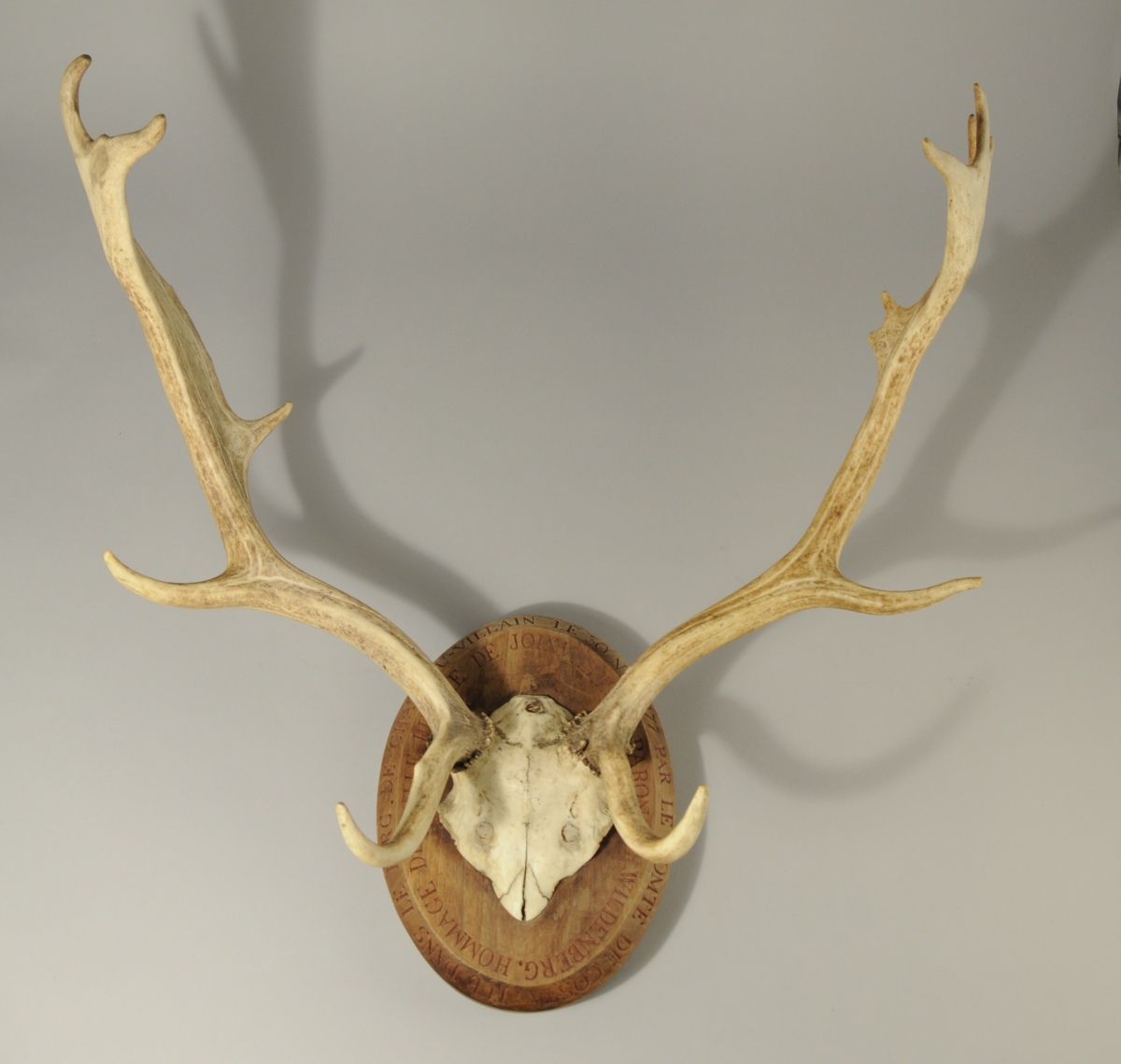 MASSACRE de DAIM. Écusson de forme ovale en bois gravé en lettres rouges " TUE DANS LE PARC DE CHATEAU-VILLAIN LE 30 Nbre 1877 PAR LE COMTE DE COSTA / HOMMAGE DE Mgr LE PRINCE DE JOINVILLE AU BARON DE WILDENBERG". Poinçonné au revers "Xavier des Mazis".