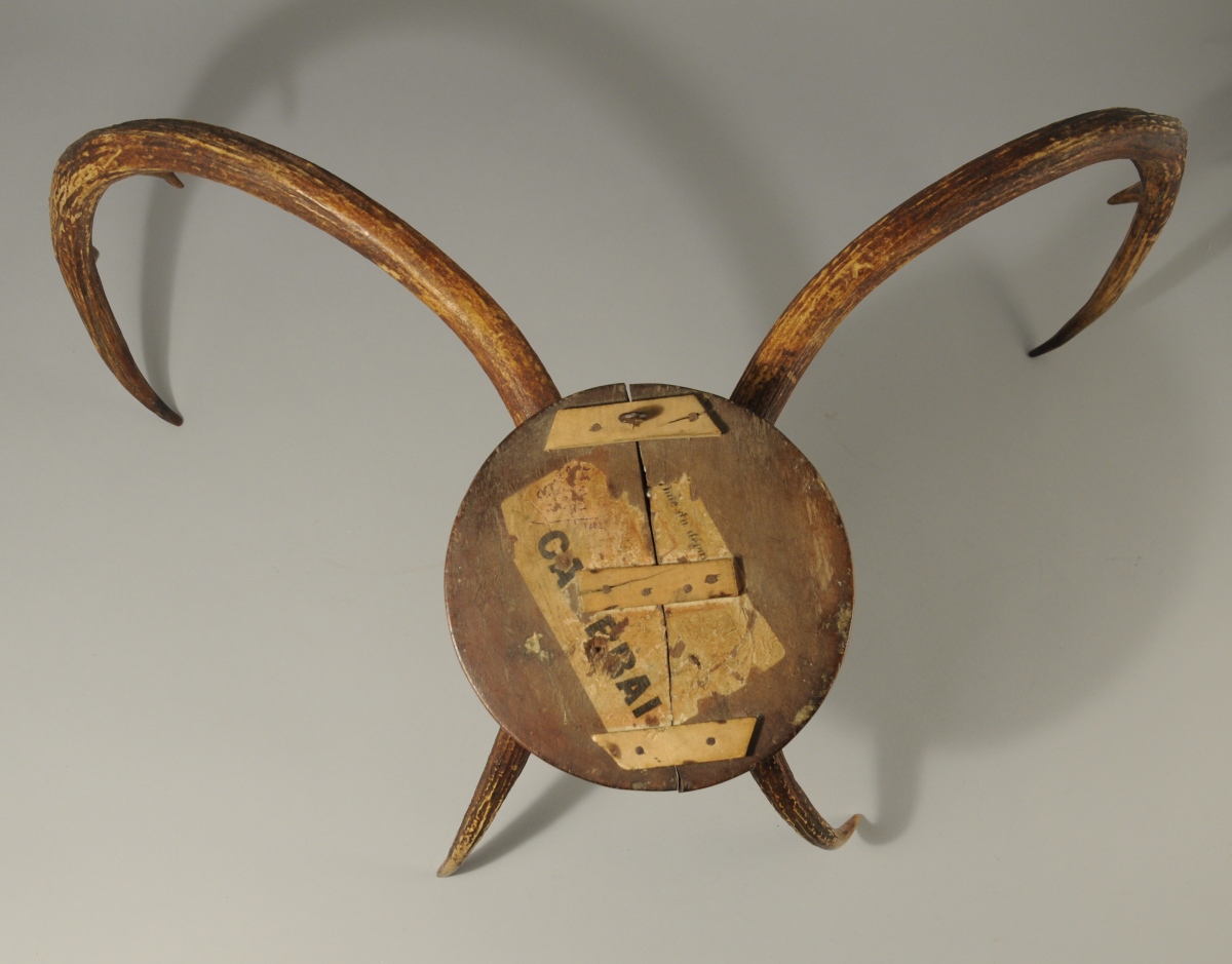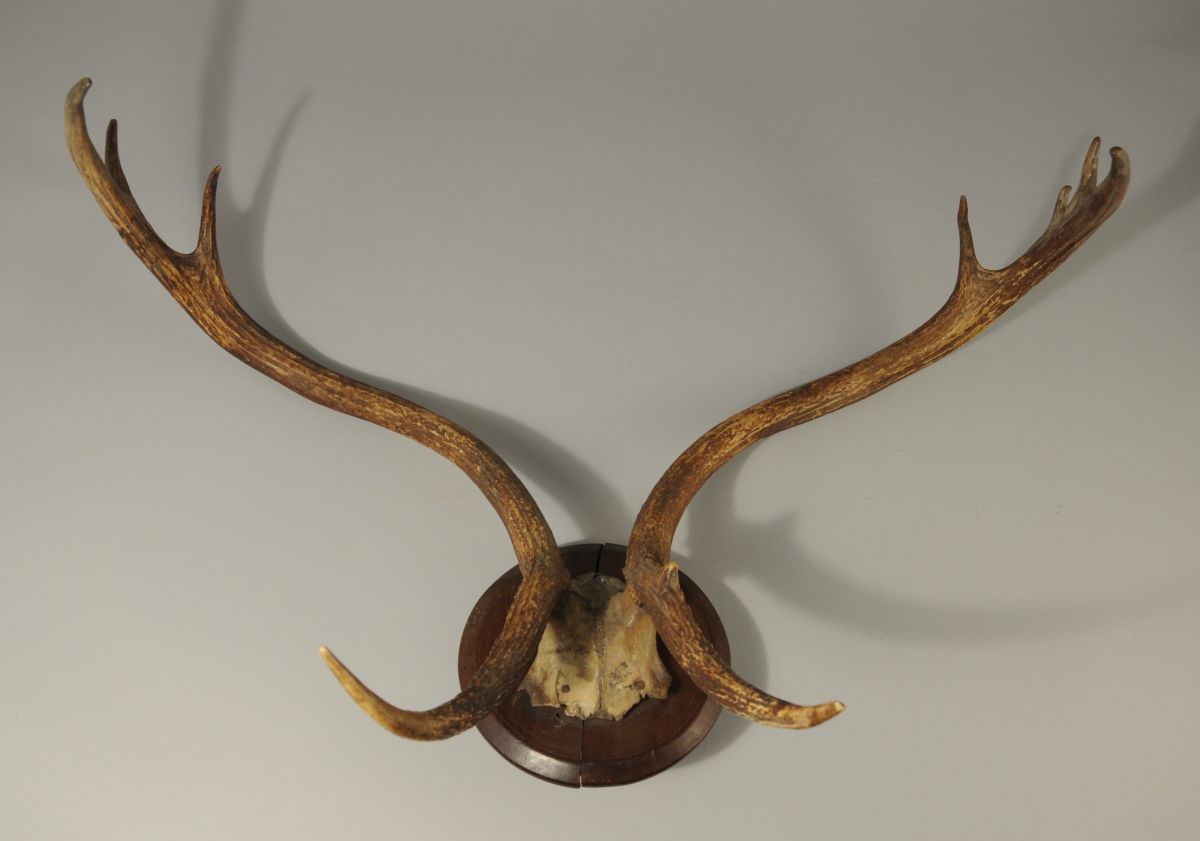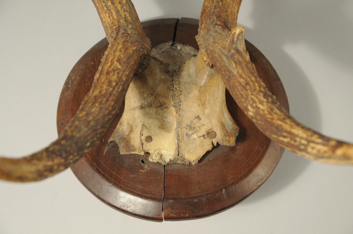 MASSACRE de CERF, 7 cors. Ancien écusson de forme ronde en bois mouluré.
