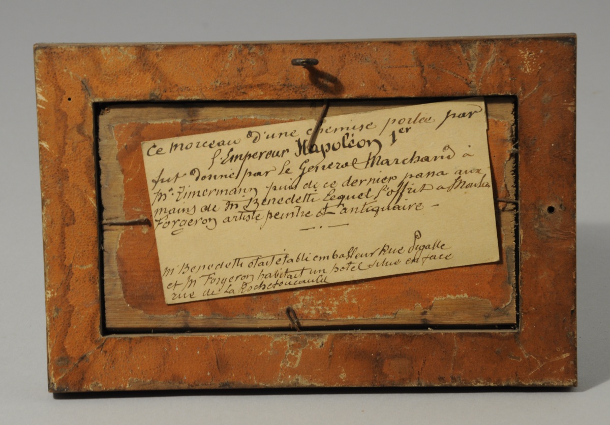 FRAGMENT D'UNE CHEMISE PORTÉE PAR L'EMPEREUR. Sur un papier portant la mention manuscrite à l'encre: "Morceau d'une chemise portée par l'empereur napoléon, et donné par Mr. Marchand à M. Zimmermann".