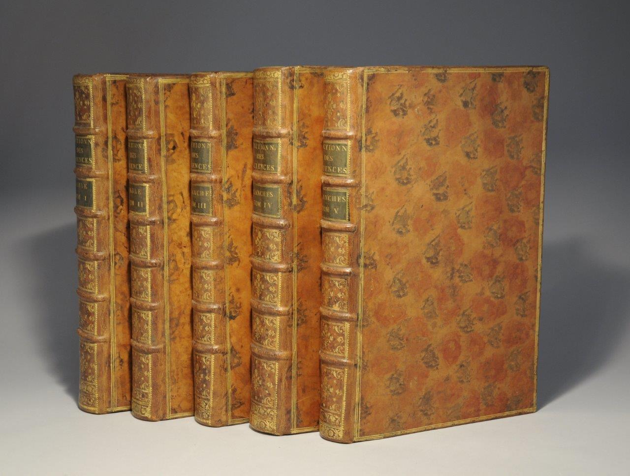 35 volumes in-folio. Reliures du temps en plein veau raciné. Reliures ornées de fers parfaitement homogènes. Toutes tranches dorées sur jaspure. Les coiffes, coins et mors ont été parfaitement restaurés. Le volume de la " Suite du Recueil de Planches (ou tome XII des planches), dont le corps est très légèrement plus court, a été lavé: il a été revêtu d'une reliure pastiche remarquablement établie ( à la fin du XXème siècle, probablement par Duval) ornée des mêmes fers.