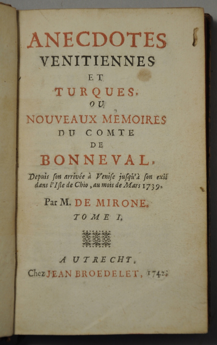 Anecdotes vénitiennes et turques, ou Nouveaux Mémoires du Comte de Bonneval depuis son arrivée à Venise jusqu'à son exil dans l'Isle de Chio, au mois de mars 1739. Par M. de Mirone.