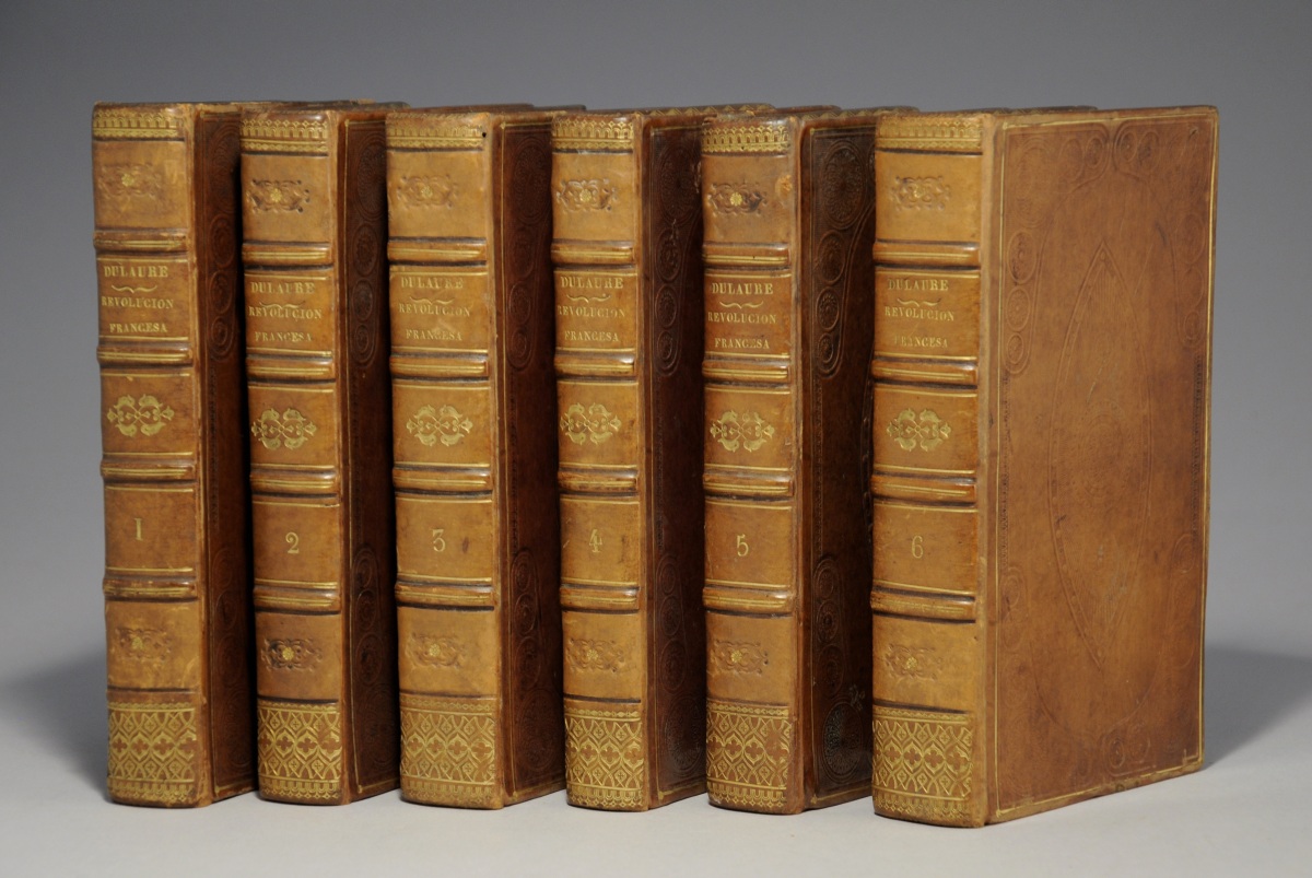 6 volumes in-8. Très élégantes reliures en plein veau glacé noisette ; riche décor sur les plats, composé de 4 larges fers dans les angles, à fond de croisillons, sur lequel se détachent 6 rosaces de formats et de motifs divers ; au centre, un important ovale dans lequel s'inscrivent 3 rosaces complexes sur un fond rayonnant. Décor à froid, cerné d'un filet droit doré. Dos orné à froid et à chaud, à 4 faux-nerfs. Toutes tranches dorées. (Infimes frottis aux reliures. Rousseurs éparses. Le dernier cahier du tome IV manque. Un cachet circulaire dans la marge inférieure des titres a été découpée).