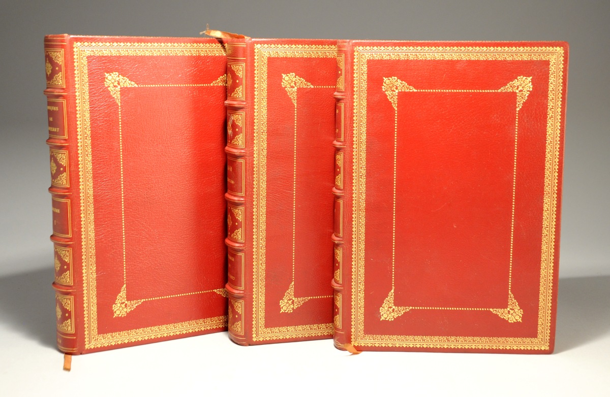 4 tomes en 3 volumes in-folio (285 X 200), plein maroquin cerise à gros grains, encadrement de roulettes et de filets dorés, décor à la Du Seuil avec filet au pointillé. Gardes de moire, avec encadrement de roulettes et de filets droits. Reliure du XXème siècle portant l'étiquette et la signature frappée de Frederico d'Almeida, relieur à Lisbonne.