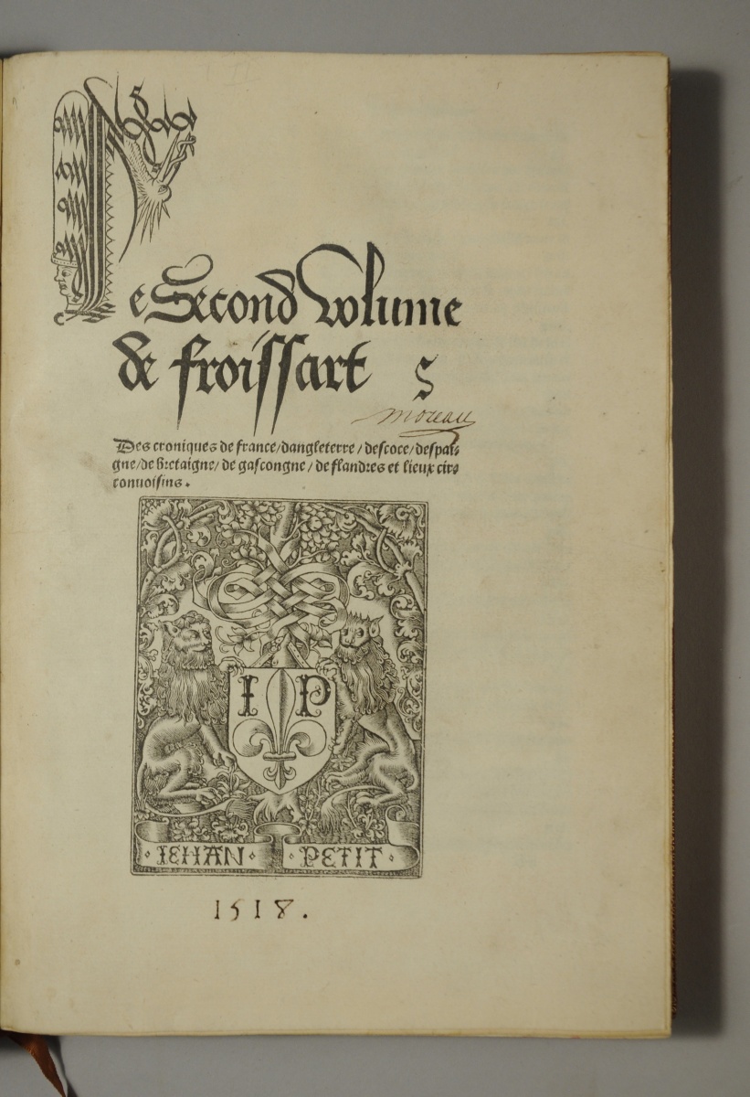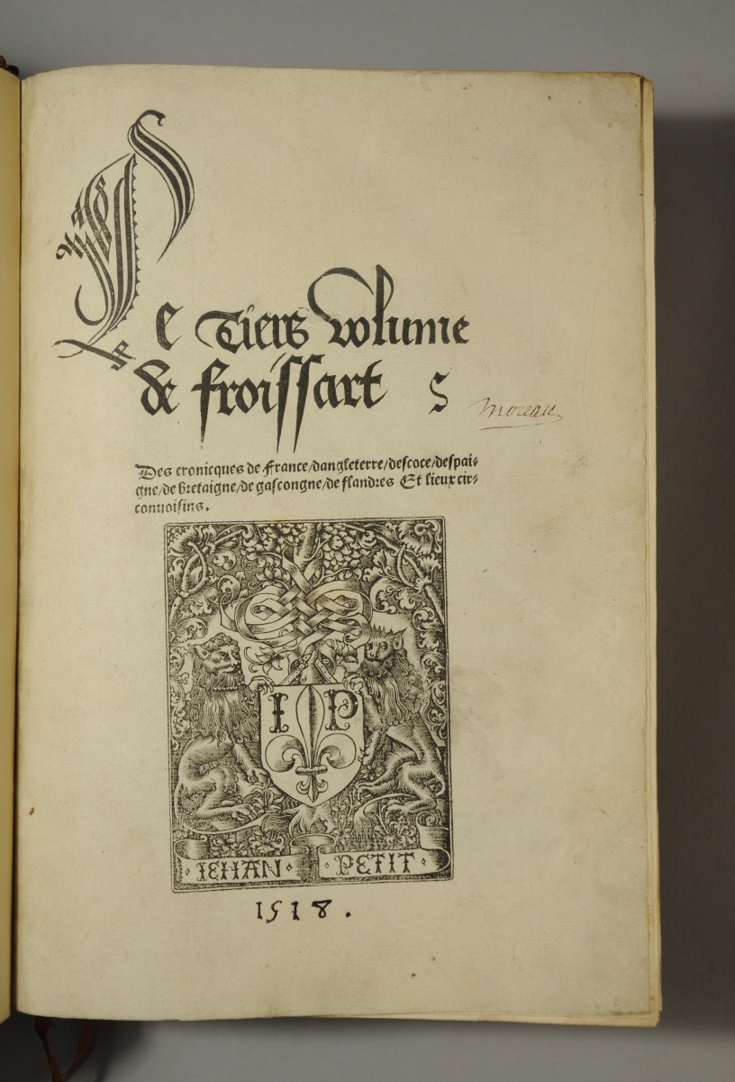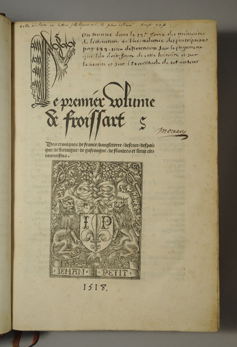 Bel exemplaire de cette chronique fondamentale pour la connaissance de la Guerre de Cent Ans, imprimée en gothique cursif. L'édition a été partagée entre Jehan Petit, Antoine Vérard, François Regnault. Les livres I, II et IV portent la marque de Jehan Petit sur le titre et au verso du dernier feuillet ; le livre III ne la porte qu'au titre. Seul le tome IV porte la date.