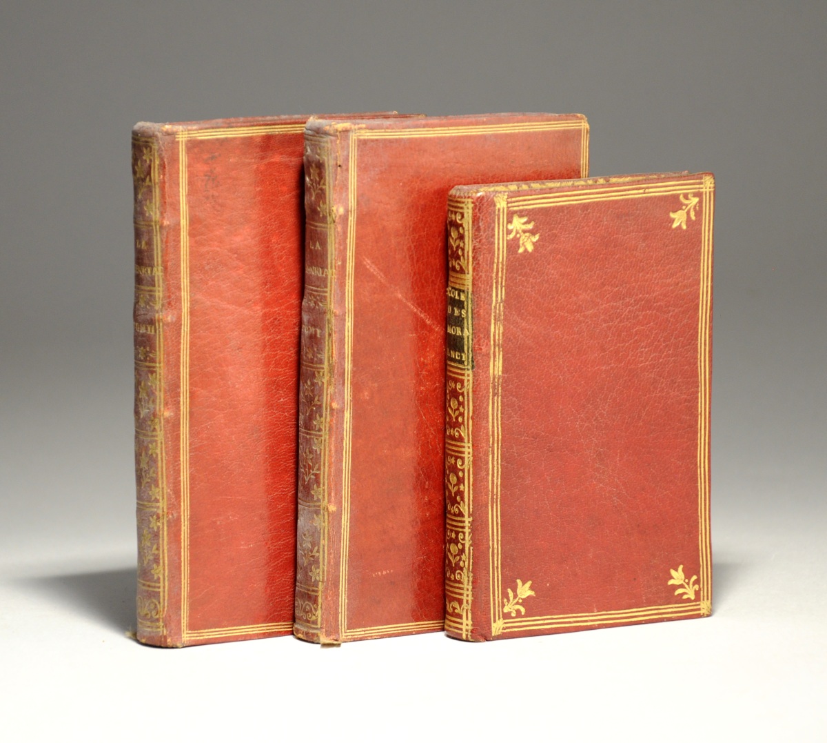 In-16, plein maroquin rouge, filets d'encadrement et fleurons d'angle. Toutes tranches dorées. Reliure du temps.