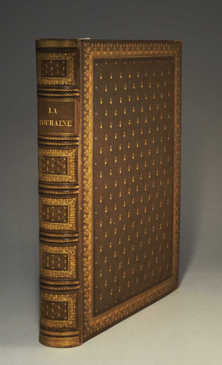 Grand in-folio, plein chagrin havane, large roulette d'encadrement à décor floral, cerné de 2 filets à froid, et de deux filets à chaud accompagnés d'un filet doré aux pointillés ; riche décor central composé de multiples losanges formés de filets à froid, ornés dans les intersections d'un fer à l'hermine poussé à chaud ; dos orné de caissons dans lesquels s'inscrit un décor similaire, de plus petit format. Double filet droit sur les coupes ; large roulette intérieure bordée de 3 filets droits. Toutes tranches dorées. Reliure du temps. (Quelques rousseurs presque inévitables sur les hors-texte ; salissure sur la carte d'Indre et Loire. Les serpentes n'ont pas été conservées.).