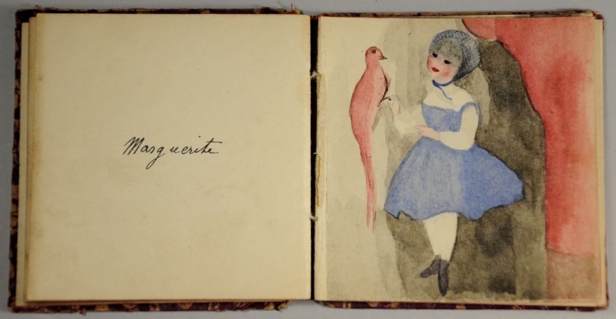 Très petit in-4° (100 X 100 mm). Cartonnage et étui éditeur en papier dominoté violine. (Le dos du cartonnage manque. L'étui est très endommagé avec manques importants. Taches de gouache sur deux portraits.)