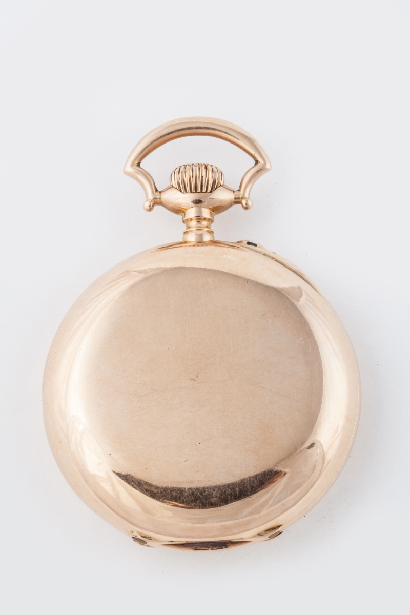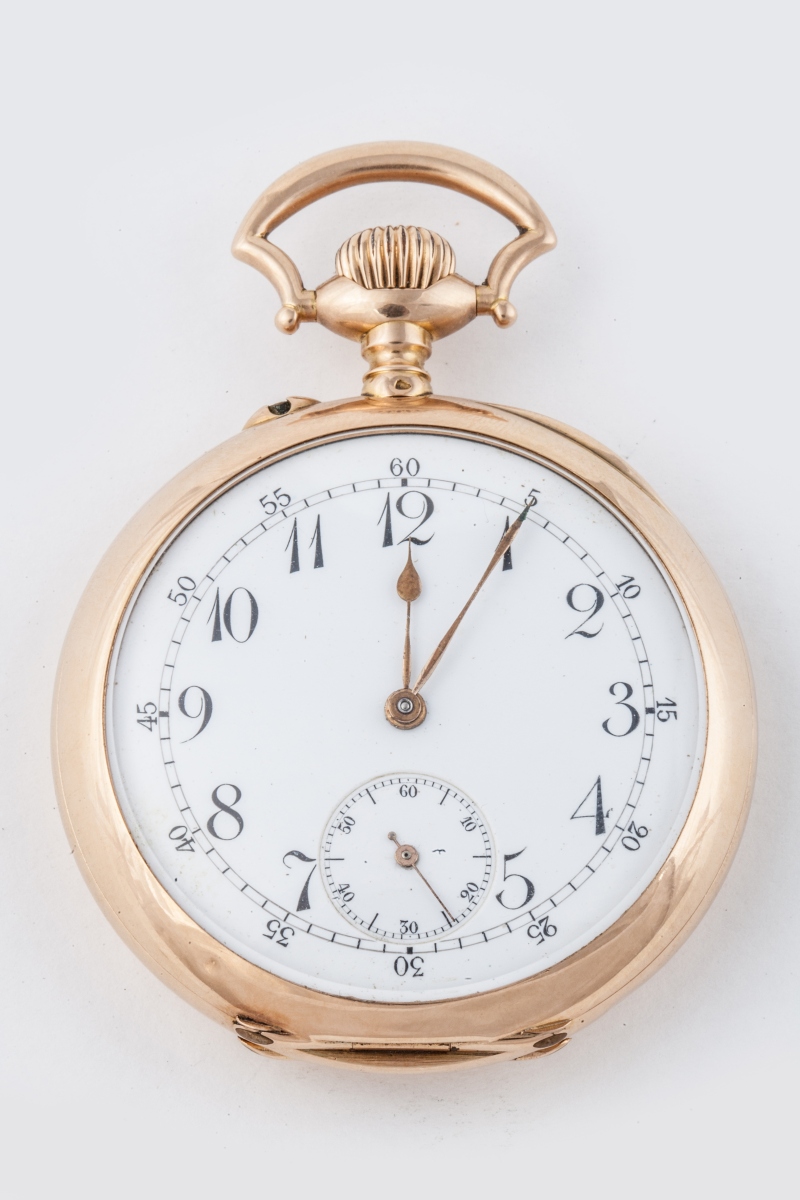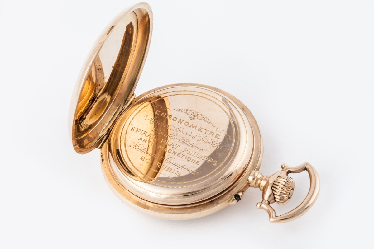 REMONTOIR CHRONOMÈTRE d'homme en or jaune. Double cadran émaillé, le plus grand marqué des heures et chaque période de 5 minutes en chiffre arabes et gradué pour les minutes, le plus petit gradué pour les secondes et marqué pour chaque périod de 10 secondes en chiffres arabes. Mécanisme à spiral plat Philipps anti magnétique, 20 rubis signé derrière un verre Le Coultre et Etienne Bersot. Boitier gousset en or jaune uni.