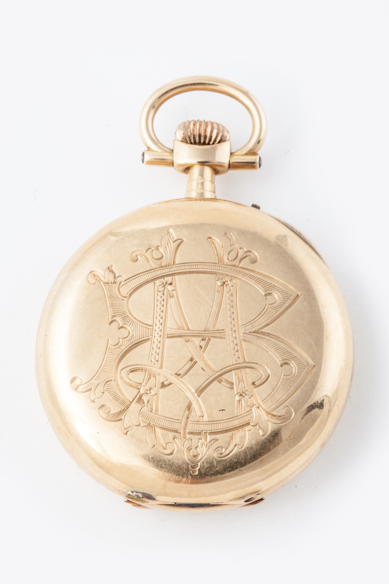 REMONTOIR d'homme en or, à double cadran émaillé signé "Chronomètre FELIX". Le grand cadran marqué des heures en chiffres romain et gradué pour les minutes, le petit cadran gradué et marqué en chiffres arabes pour chaque période de 10 secondes. La boite en or jaune monogramée BM, signée "E. Perrochon. Niort". Le mécanisme signé "Cretttiez".