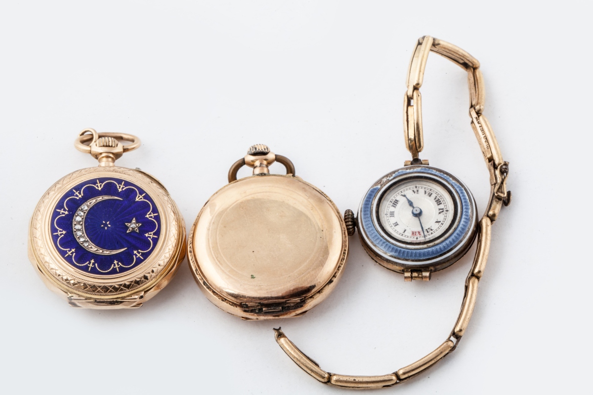 - MONTRE DE COL à remontoir en or jaune de forme circulaire. Le cadran finement émaillé et doré marqué des heures en chiffres romains et gradué pour les minutes. Le boitier délicatement émaillé bleu nuit et orné en réserve d'un croissant de lune et d'une étoile. Diam. 27 mm, Poids brut: 20,3 g.