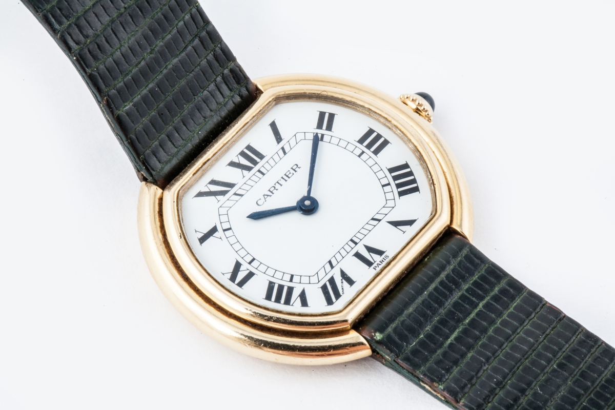 CARTIER. MONTRE "ELLIPSE" d'homme, en or jaune extra plate à mouvement mécanique. Cadran émaillé marqué des heures en chiffres arabes et gradué pour les minutes. Remontoir orné d'un cabochon en pierre bleue. Numérotée 780912477. Bracelet en cuir noir avec une boucle en or jaune. Dans son écrin. Certificat de garante internationale vierge.