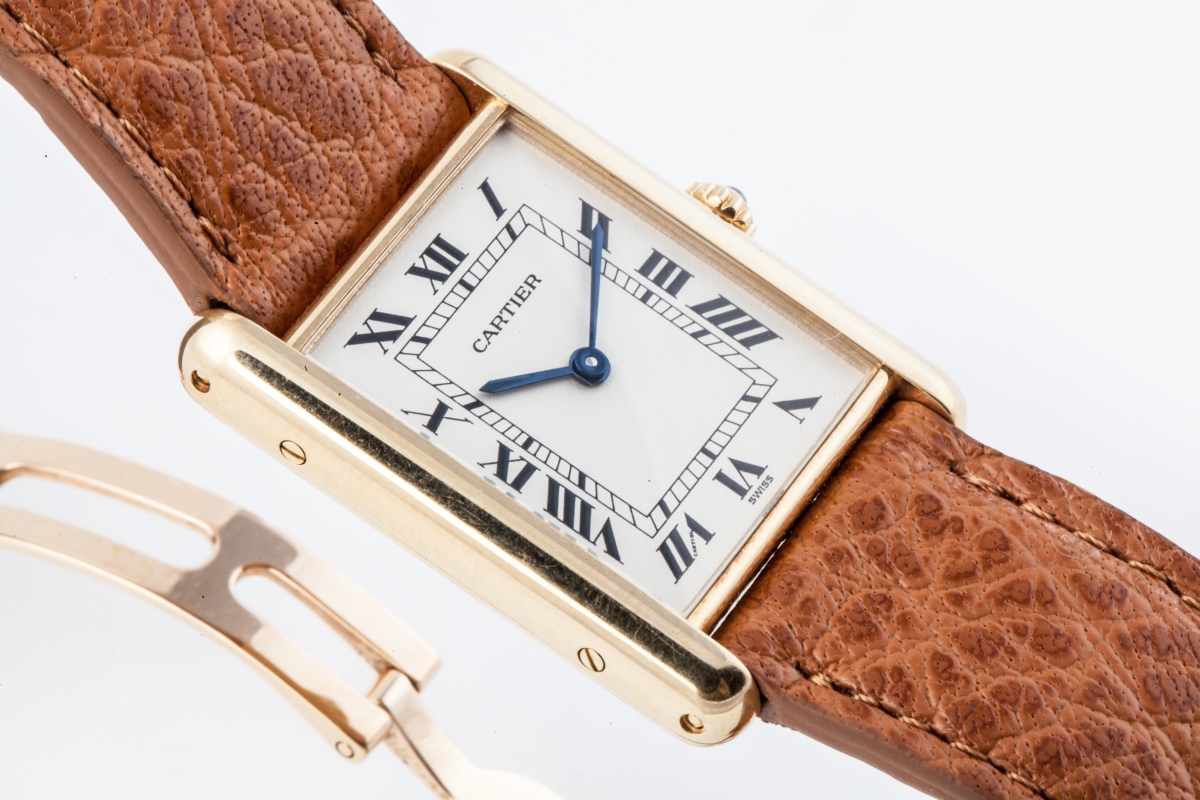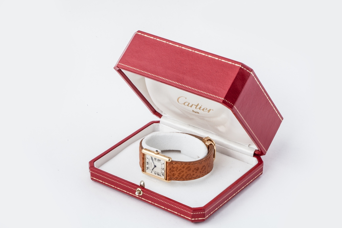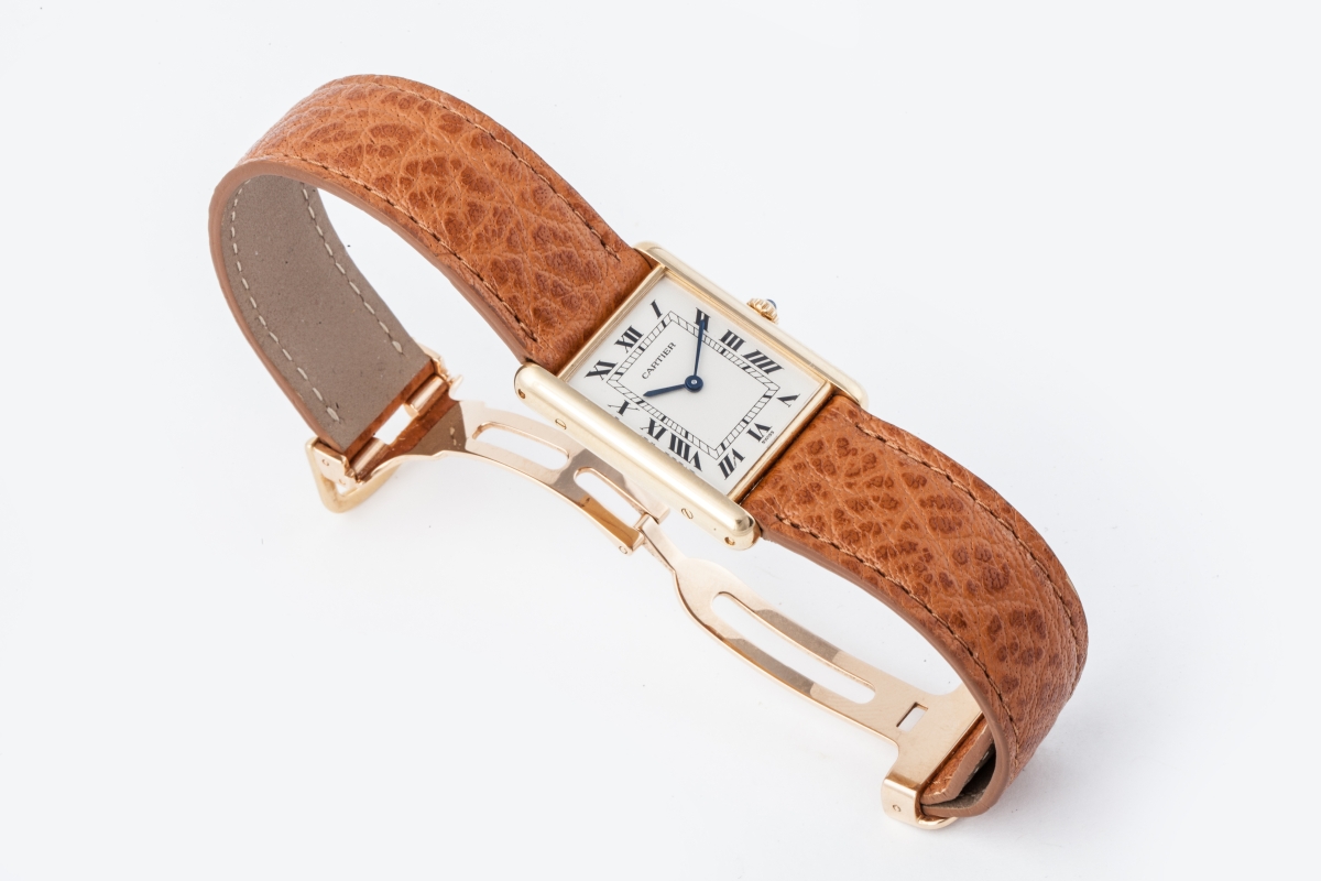 CARTIER. MONTRE "TANK" d'homme, en or jaune extra plate à mouvement quartz. Cadran émaillé marqué des heures en chiffres arabes et gradué pour les minutes. Bouton orné d'un cabochon en pierre bleue. Numérotée 11402C79786. Bracelet en crocodile avec BOUCLE AUTO DÉPLOYANTE en or jaune. Dans son écrin. certificat de garantie internationale.