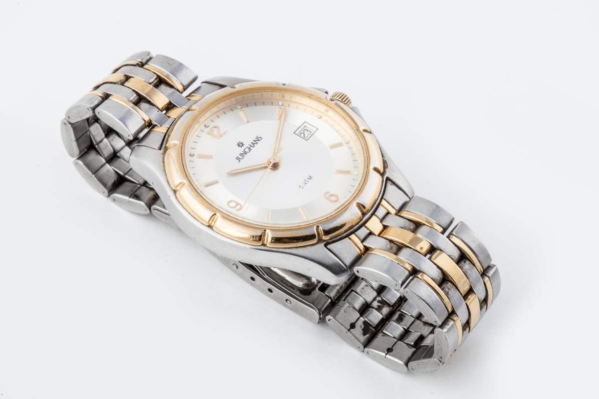JUNGHANS. MONTRE DE POIGNET d'homme de forme ronde en acier et acier doré. Cadran en métal marqué 5 ATM indiquant les heures en chiffres arabes et index bâtonnets. Guichet date à 3h. Aiguilles des heures et minutes or luminescentes et trotteuse centrale or. Bracelet à maillons articulés en acier et acier doré. Diam. 3,2 cm.