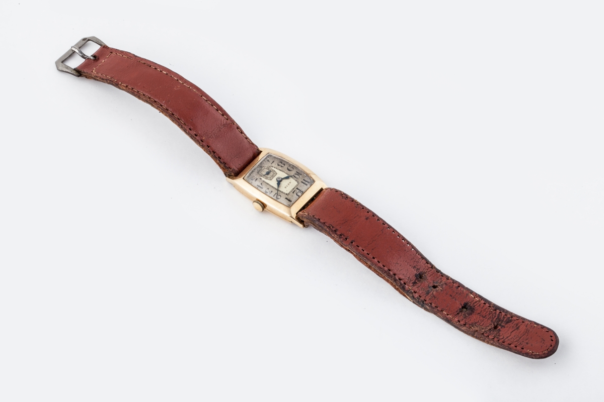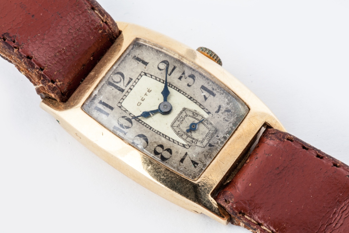 GÉTÉ. MONTRE BRACELET d'homme en or de forme tonneau. Double cadran signé GÉTÉ, marqué des heures en chiffres arabes, trotteuse des secondes à 6 heures. Mouvement mécanique. Bracelet cuir.