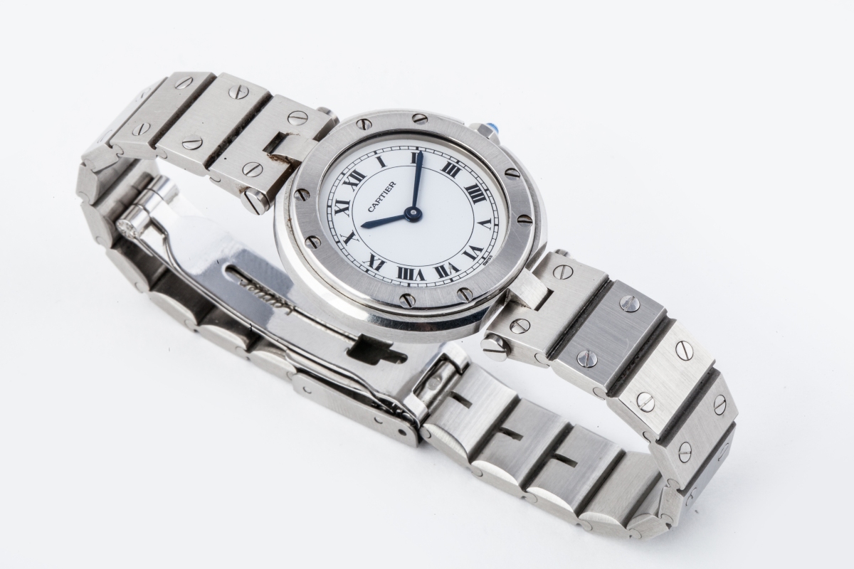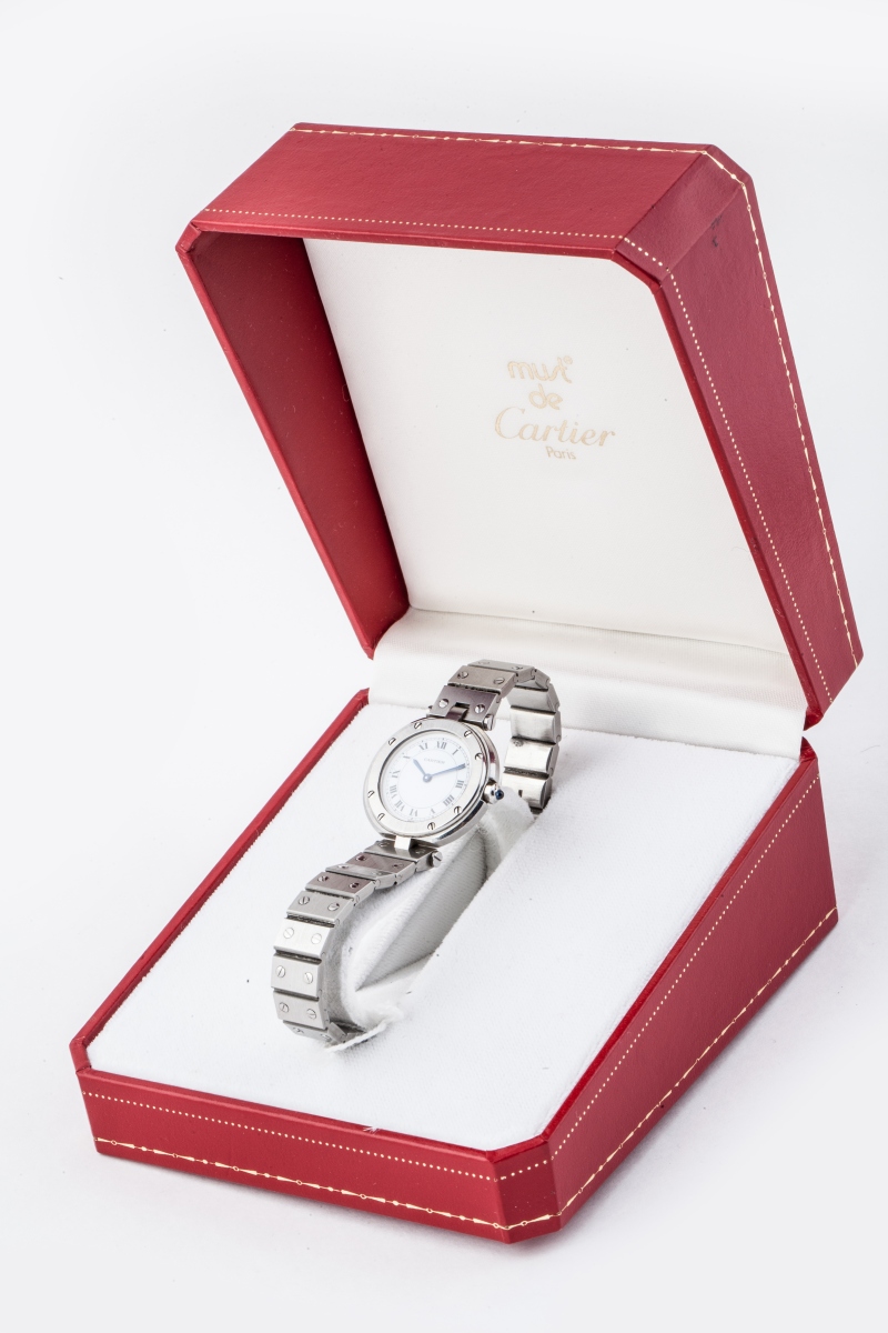CARTIER. MONTRE "SANTOS" de femme, en acier à mouvement quartz. Cadran émaillé marqué des heures en chiffres arabes et gradué pour les minutes. Vis tête en acier. Bouton serti d'un cabochon bleu. Numérotée 8192400530. Bracelet articulé en acier avec boucle ardillon (mailles suplémentaires). Dans son écrin.