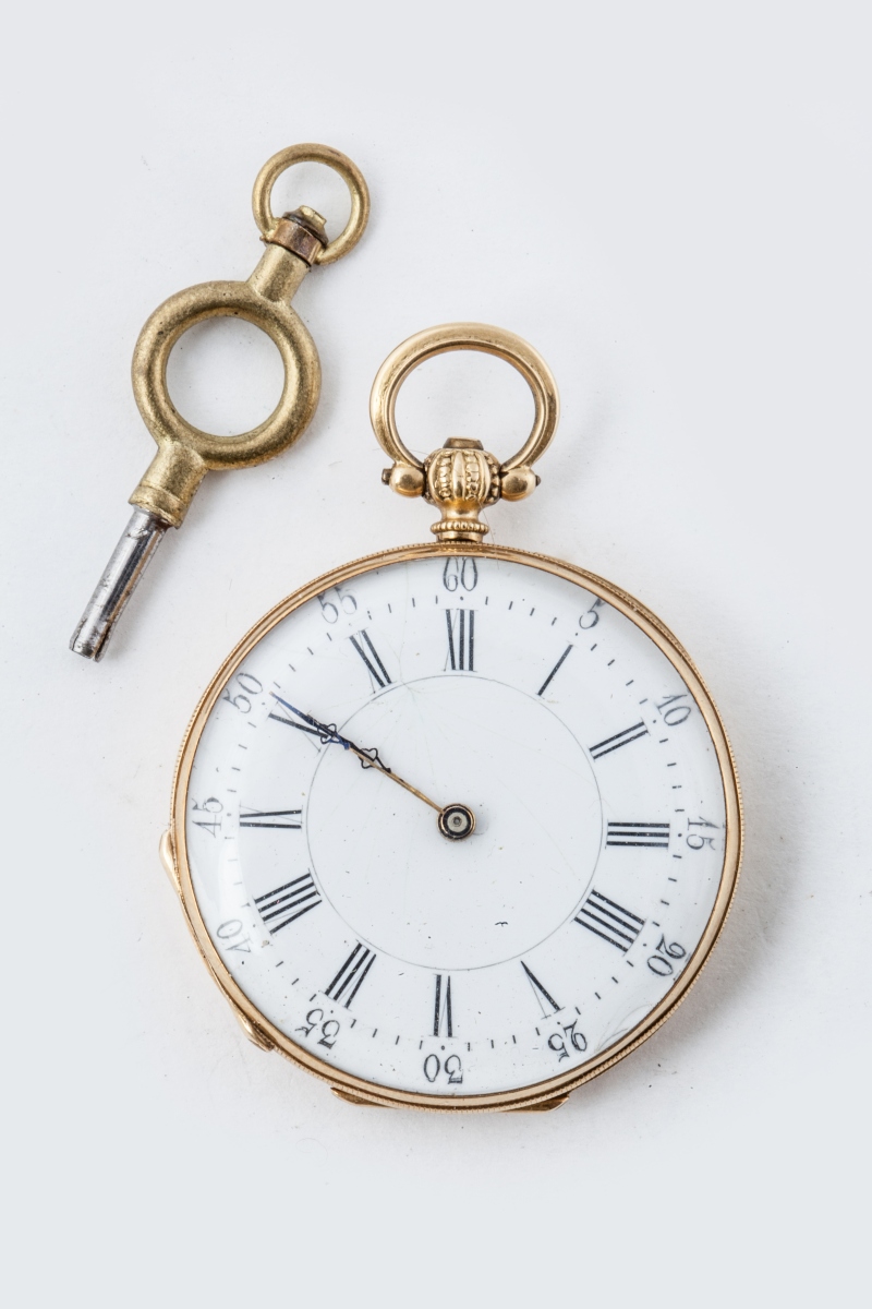 Petite MONTRE À GOUSSET d'homme en or jaune cadran émaillé gradué pour les minutes, les heures en chiffres romains, chaque période de 5 minutes en chiffres arabe. Clé.