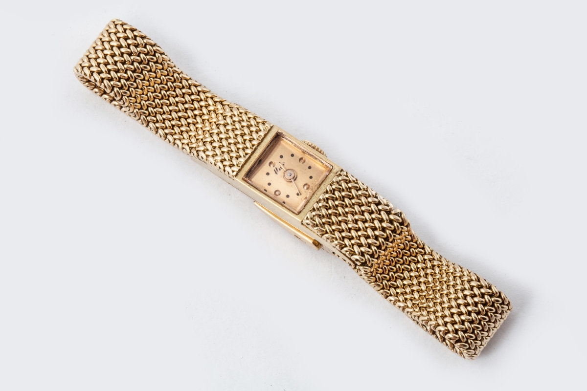 MONTRE BRACELET de dame en or jaune, lunette de forme rectangulaire, le cadran en or, gradué pour les heures, signé "Uto". Bracelet ruban. Mouvement mécanique en état de marche.
