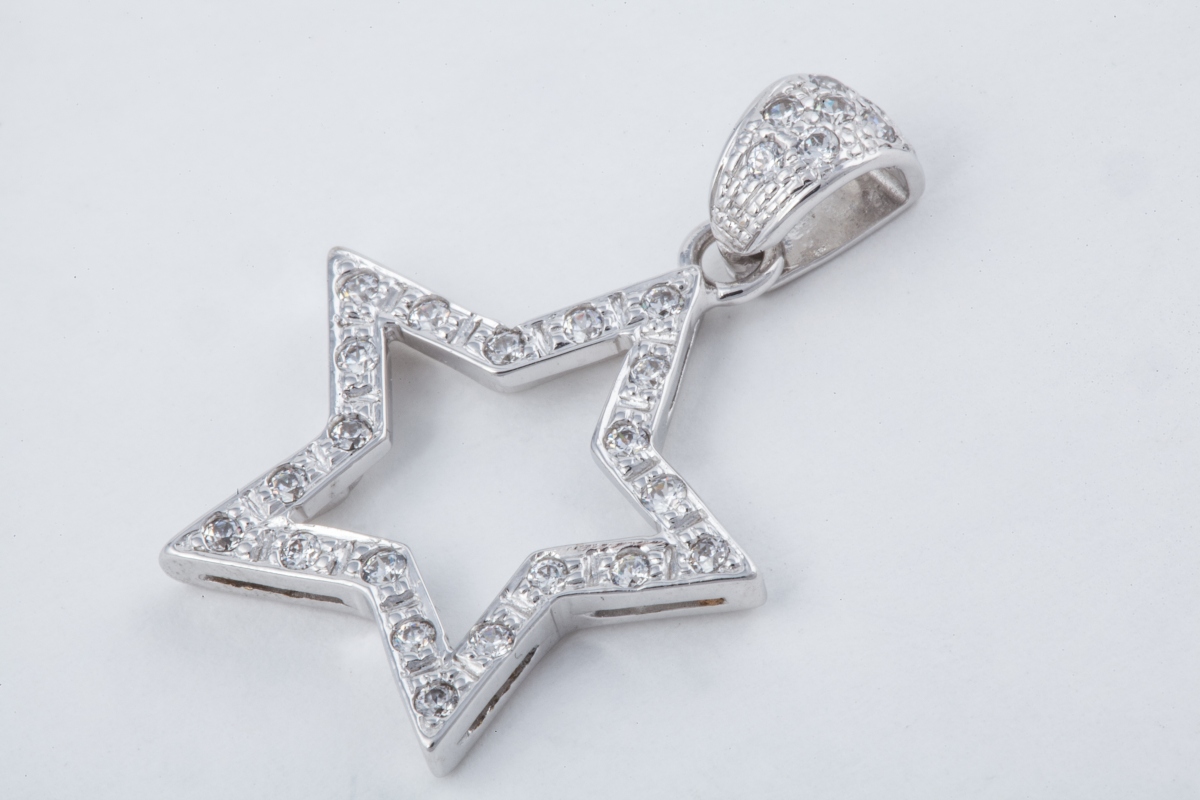 PENDENTIF "étoile" en or gris serti de pierres de synthèse blanches.