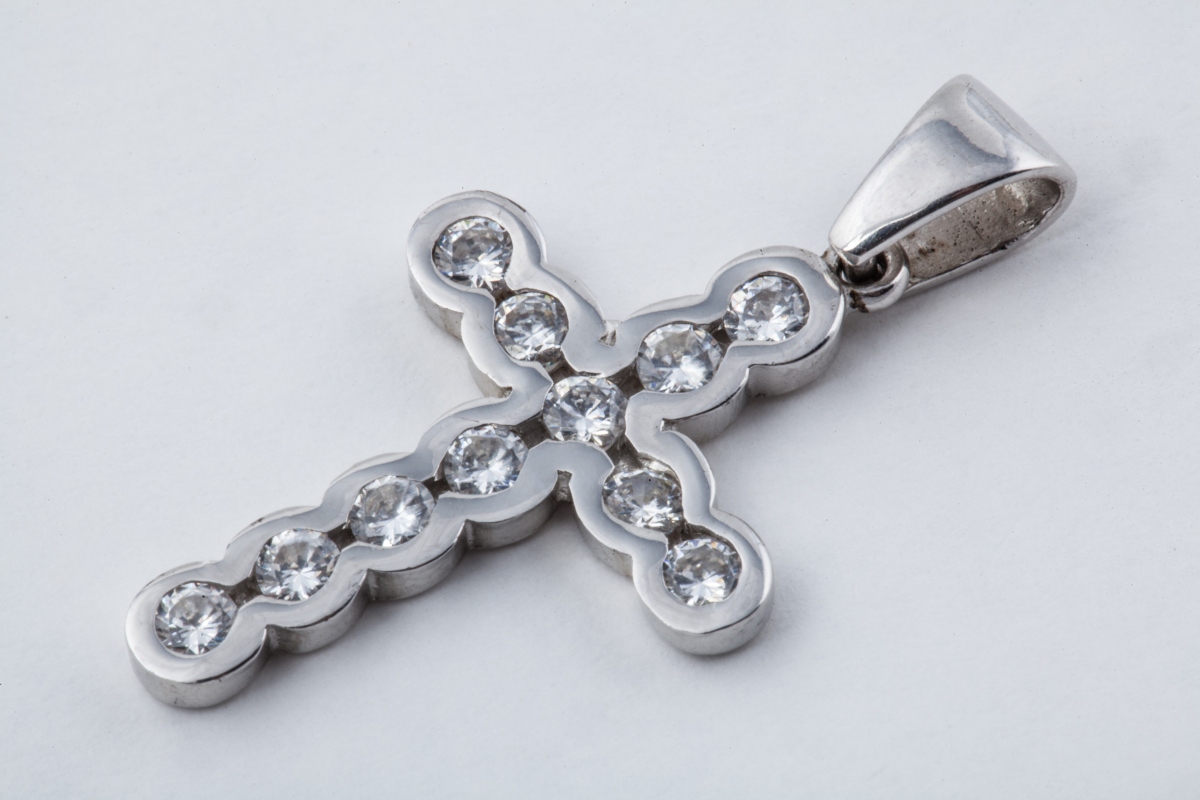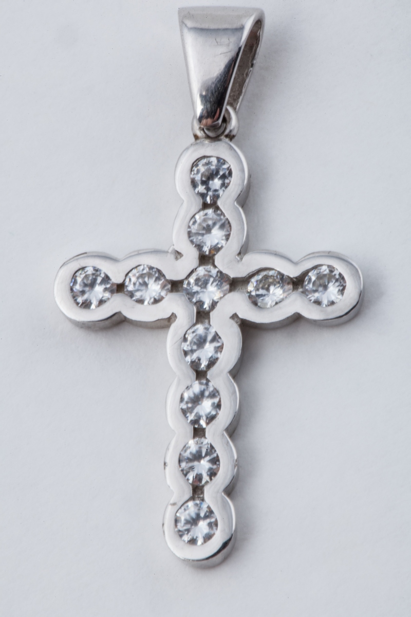 PENDENTIF croix en argent serti de pierres de synthèse blanches.