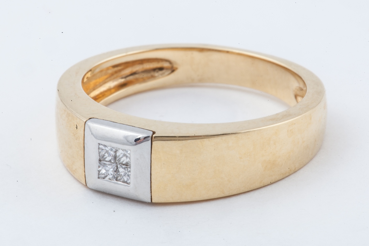BAGUE en or jaune sertie de quatre petits diamants de taille princesse.