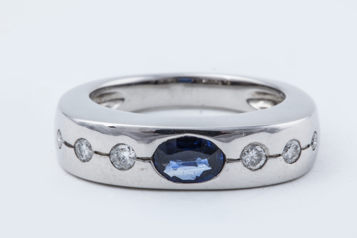 BAGUE en or gris, sertie d'un saphir ovale entre six petits diamants.