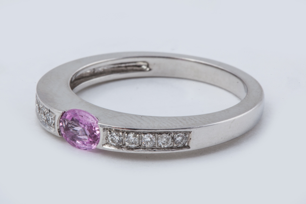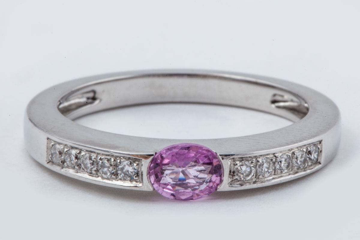 BAGUE en or gris sertie d'un saphir rose entre deux lignes de petits brillants.