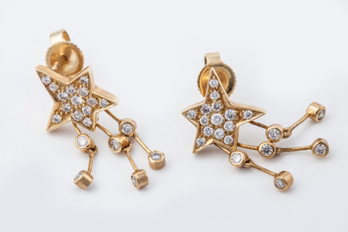 PAIRE DE PENDANTS D'OREILLES "étoile" en or jaune, sertie de diamants.