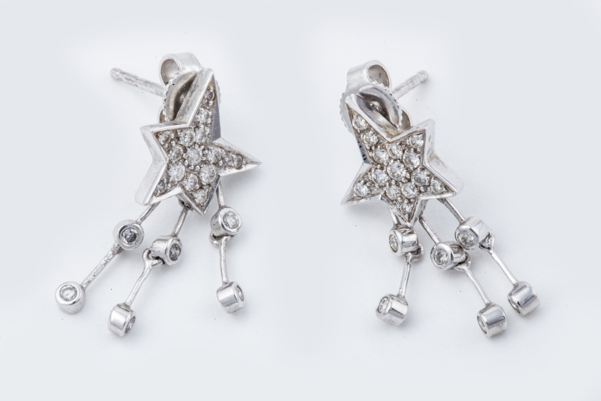 PAIRE DE BOUCLES D'OREILLES "étoile" en or gris, sertie de petits diamants.Poids brut: 3 g