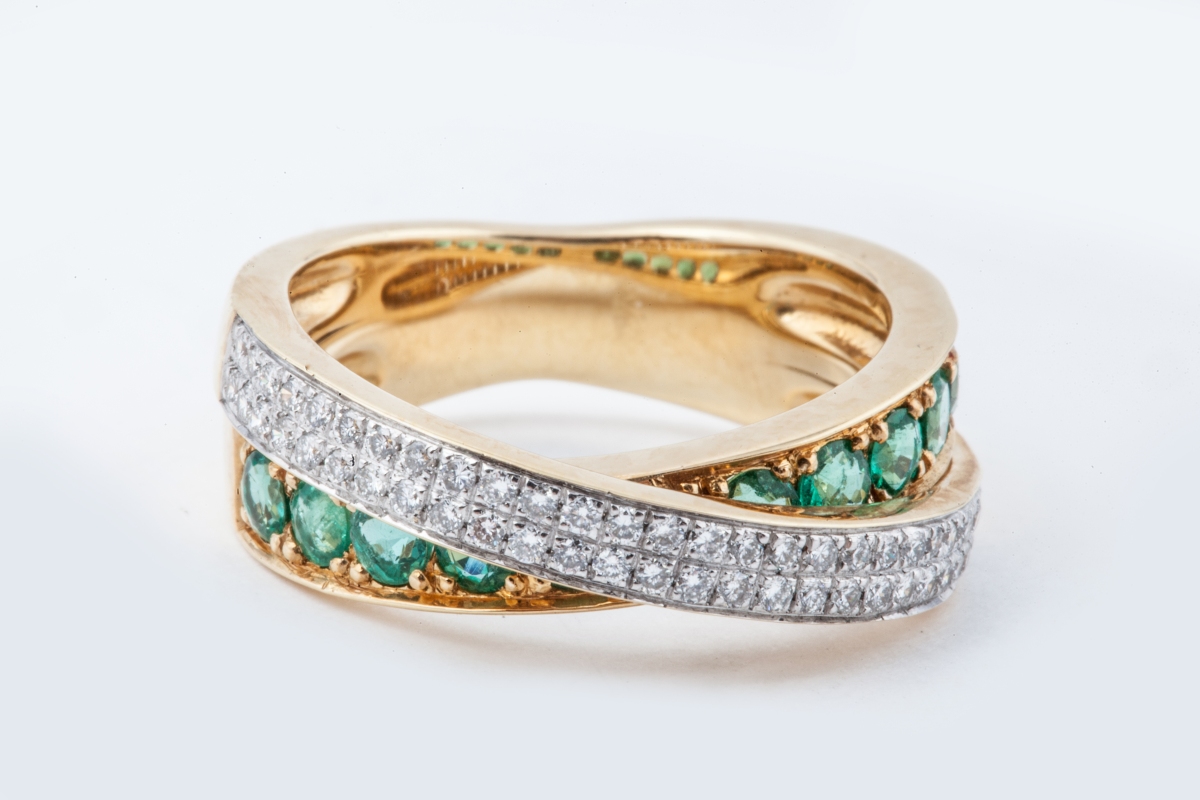 BAGUE en or jaune à entrelacs, décorée d'une ligne d'émeraudes et d'un pavage de diamants ronds.