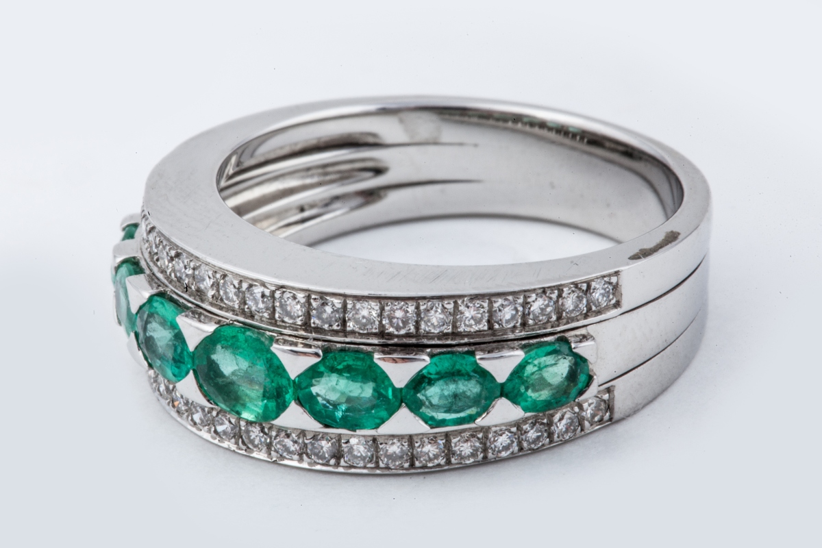 BAGUE en or gris, sertie d'une ligne d'émeraudes de forme ovale entre deux lignes de petits diamants.
