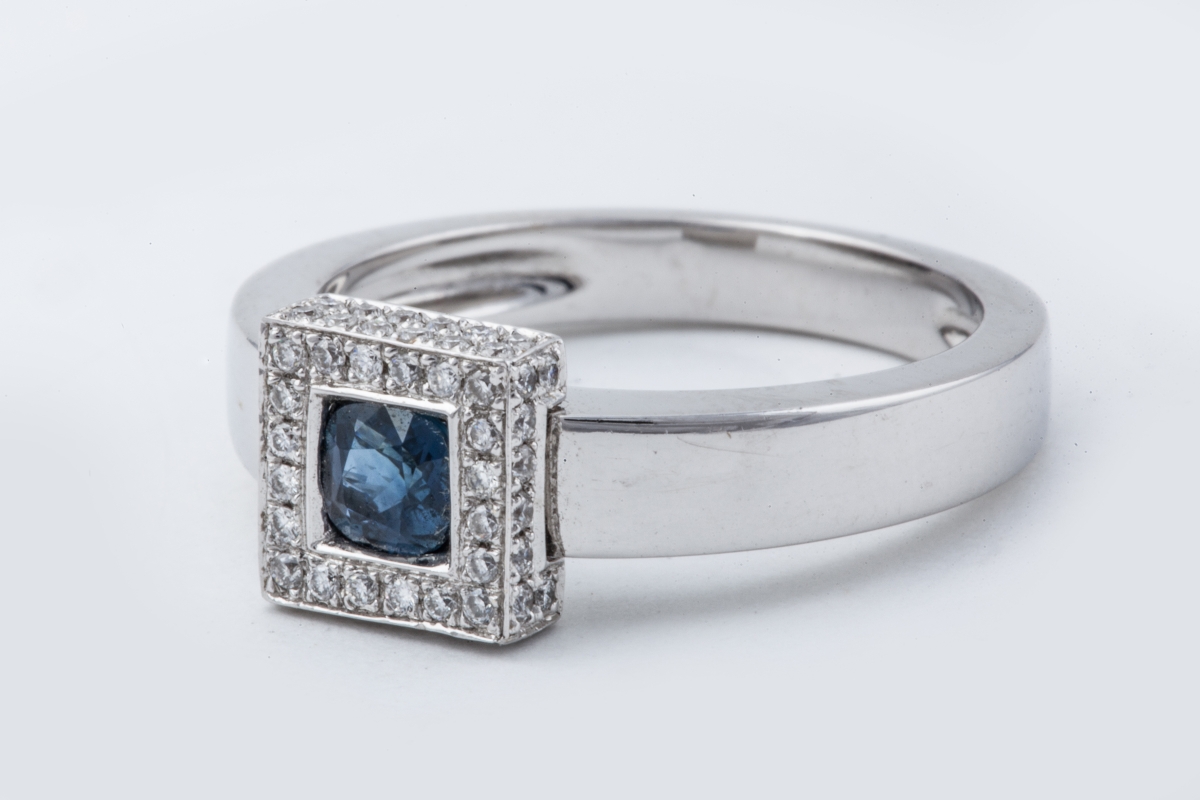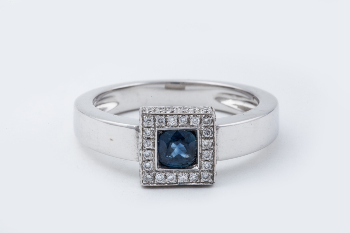 BAGUE en or gris, décorée d'un motif carré orné d'un saphir de forme coussin dans un pavage de diamants.