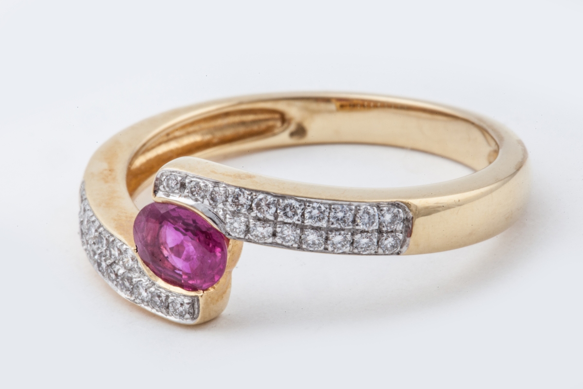 BAGUE en or jaune à décor d'entrelacs, ornée d'un rubis entre deux pavages de diamants.