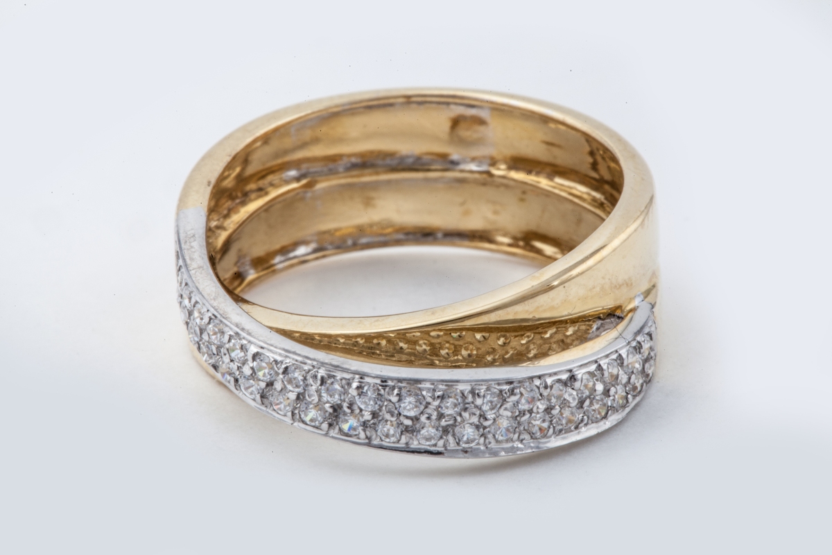 BAGUE en or de deux tons à décor d'entrelacs, ornée de deux lignes de pierres de synthèse blanches.