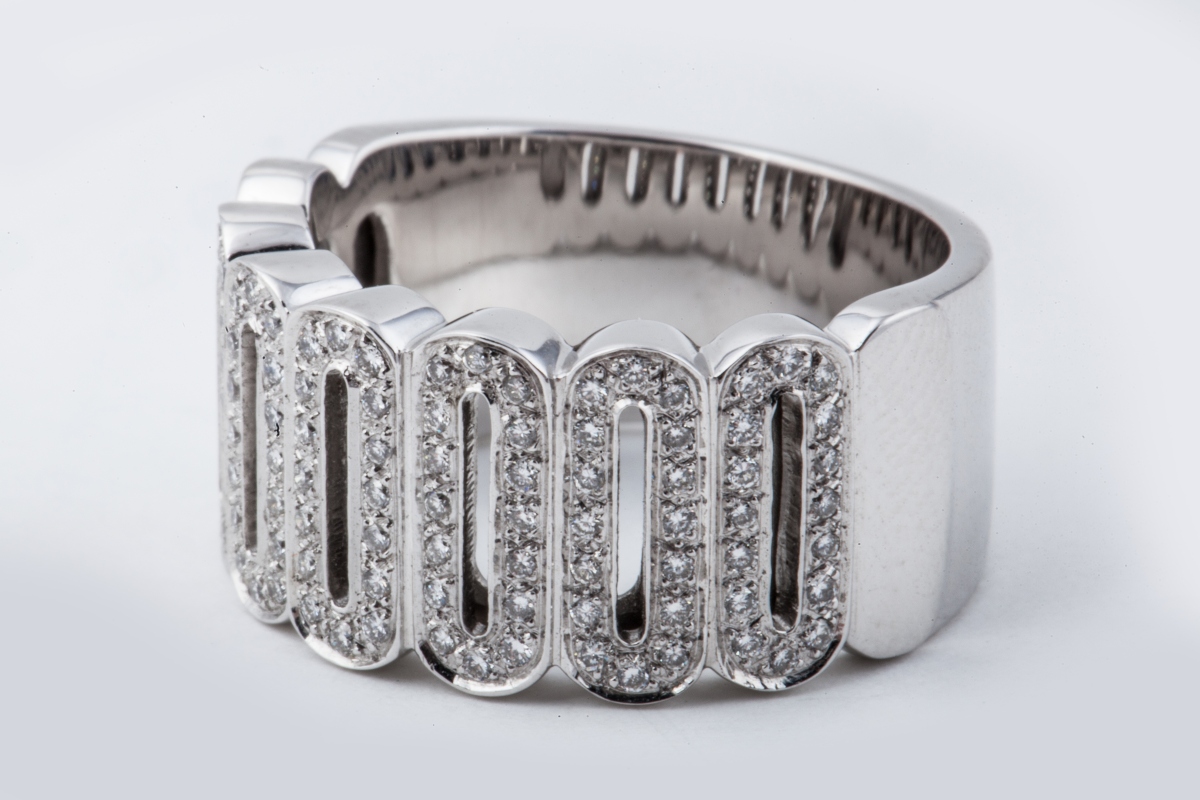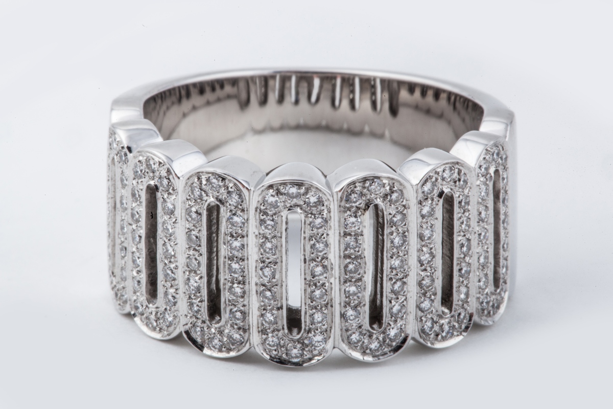 BAGUE bandeau en or gris ajouré, partiellement pavée de diamants ronds.